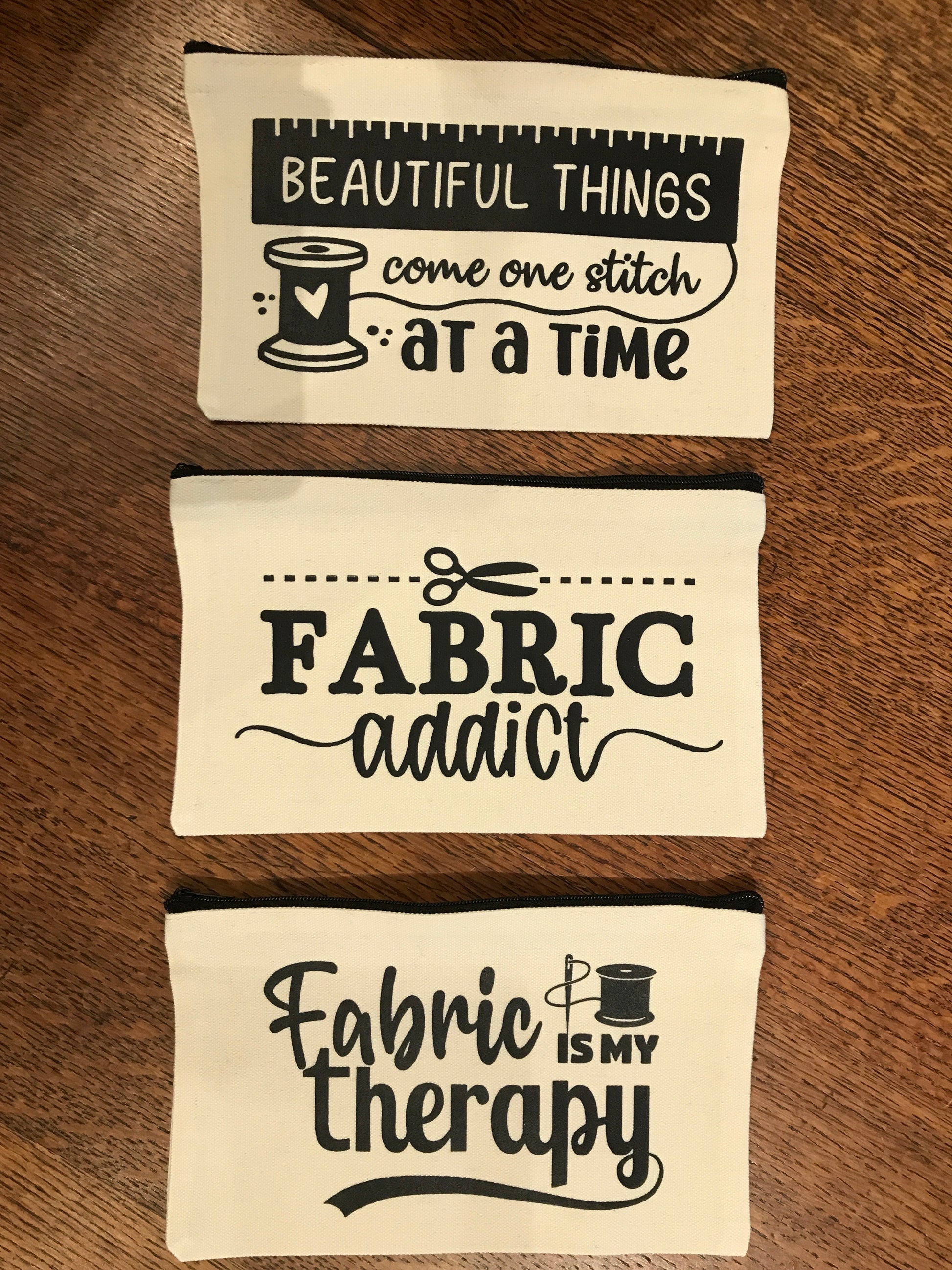 These zip top canvas pouches are ready to help you organize your sewing room, or to carry your tools with you. They have fun (relatable) sayings for yourself or the sewer in your life.