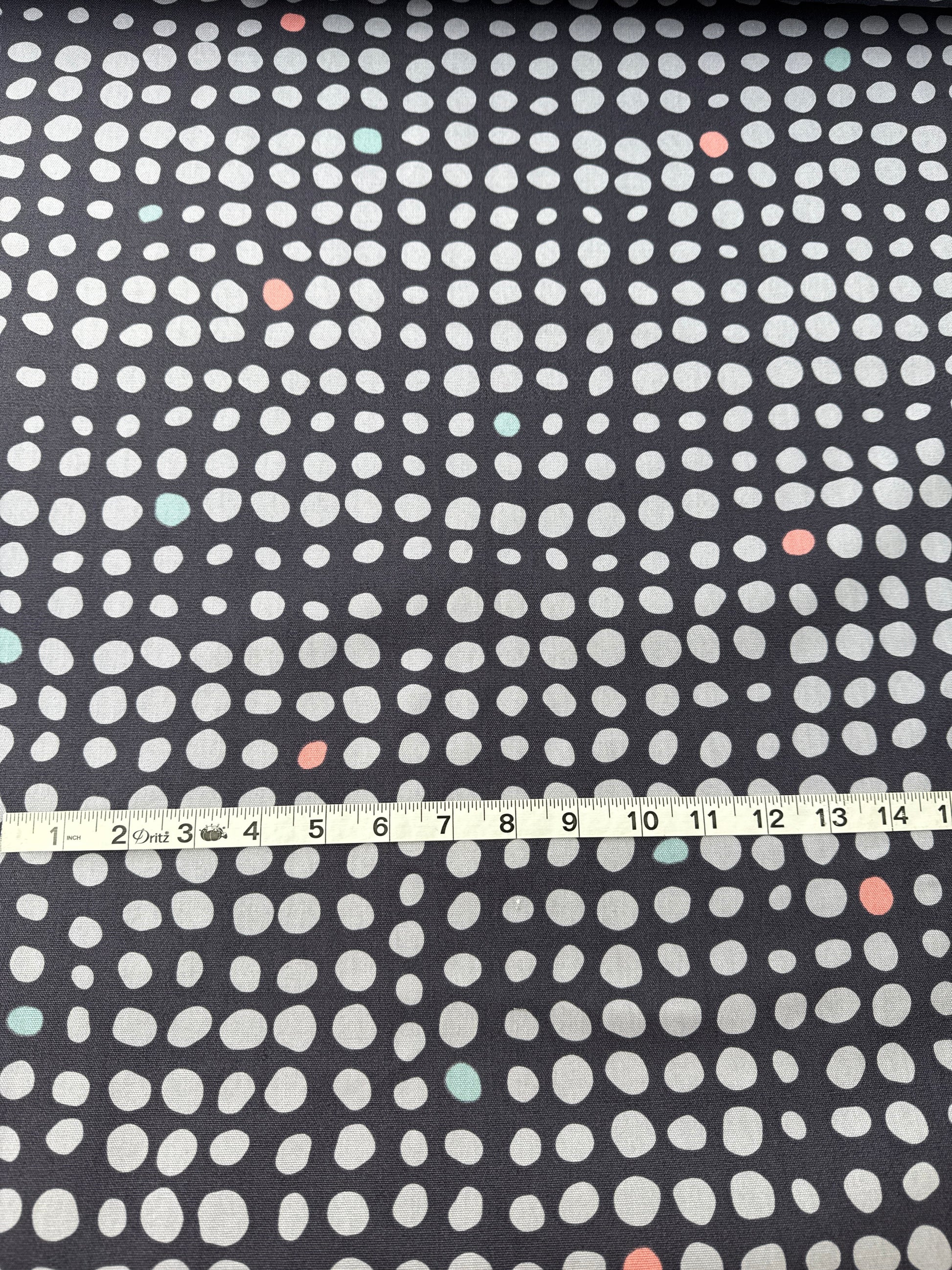 This medium weight oxford has structured drape and a soft handfeel. Navy blue background with cornflower blue and peach polka dots. Great for bags, bag lining, or a fun skirt.