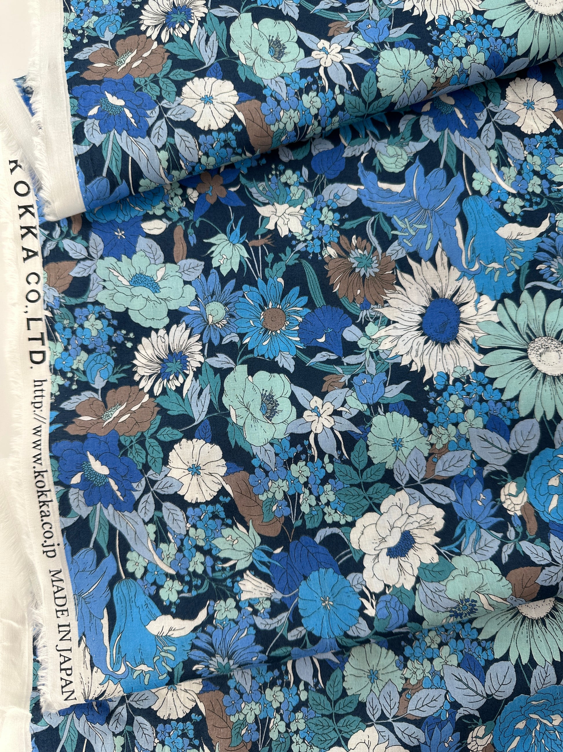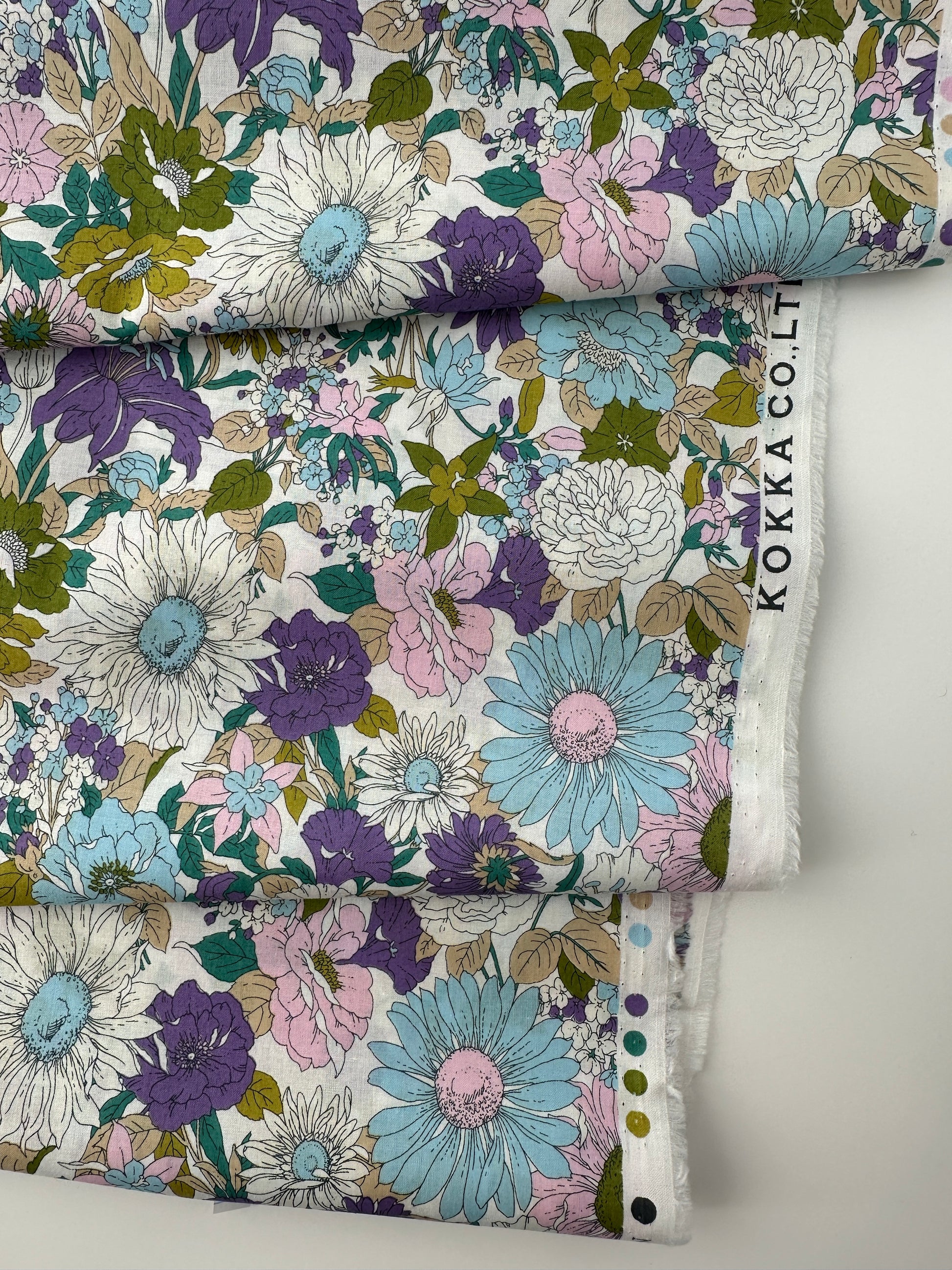 With a smooth handfeel and soft drape, this cotton lawn from Japan performs beautifully, and very similarly to more famous printed lawns. Delicate print covered in multicolored flowers. Would make an amazing blouse, sundress or billowy beach coverup.
