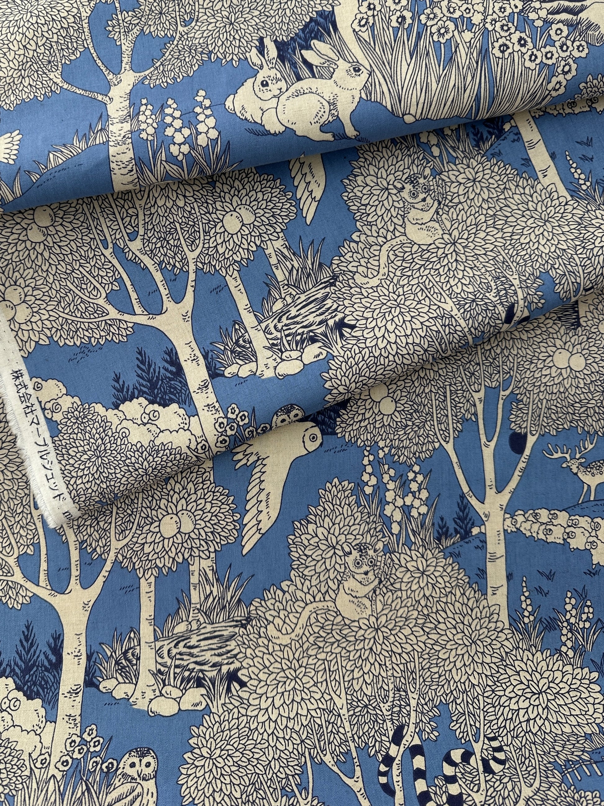 This whimsical print shows a variety of woodland creatures frolicking. The ground is medium cornflower blue with cream and navy print