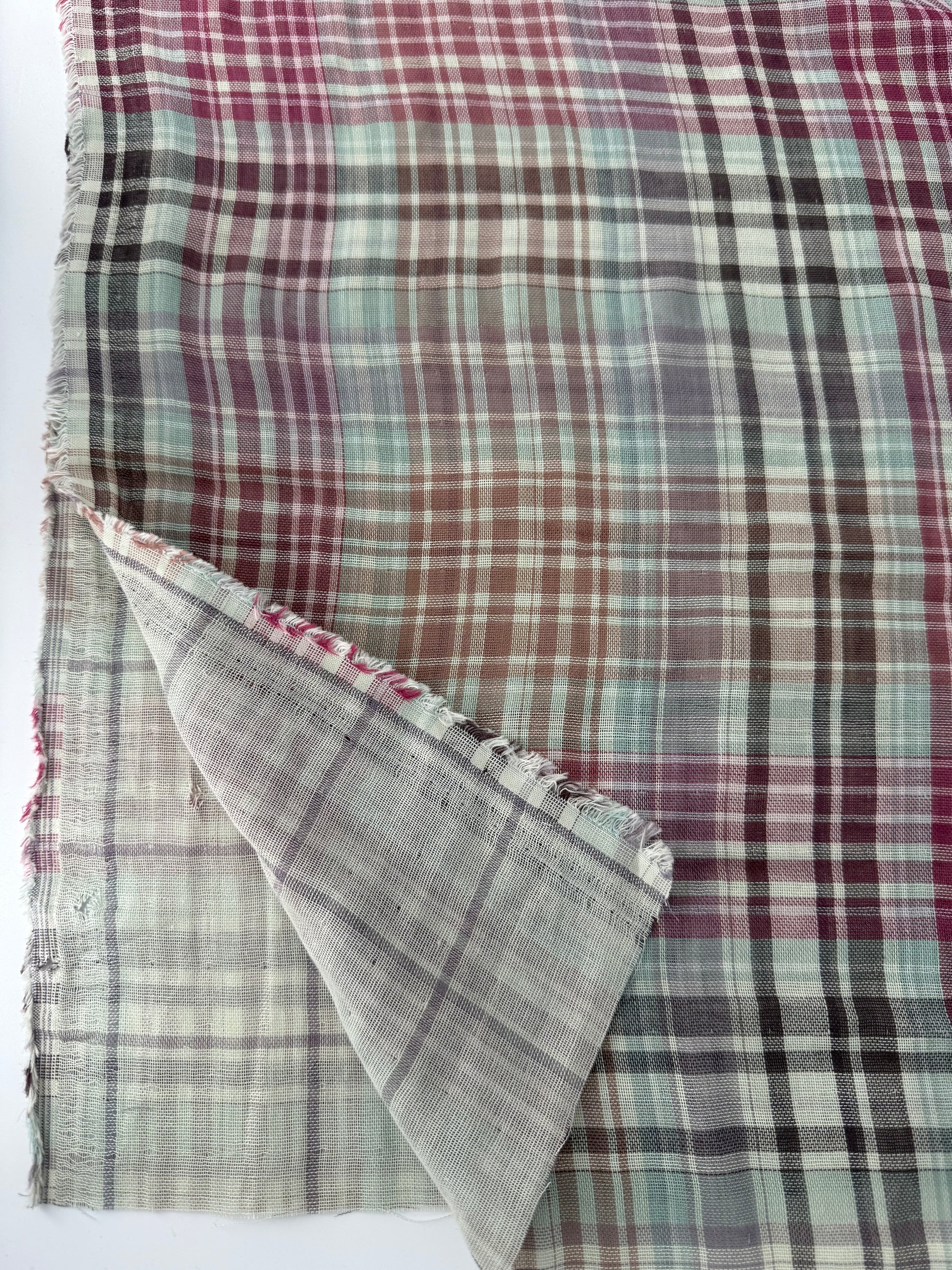 This lightweight fabric has a cheery plaid face, reminiscent of sorbet, in plums, pinks and melon colors, with a shot of blue. The back side is a windowpane in light gray and blue.