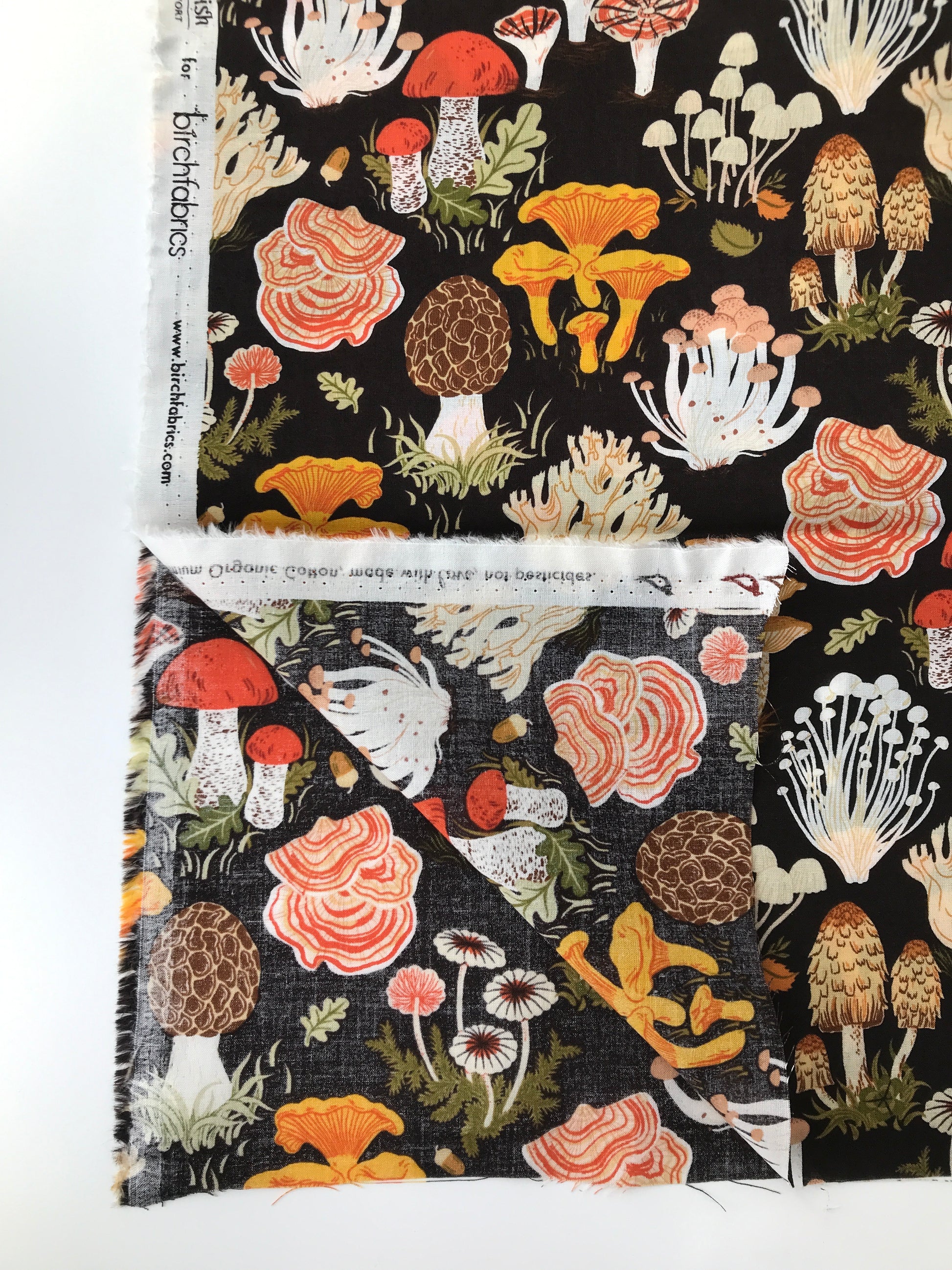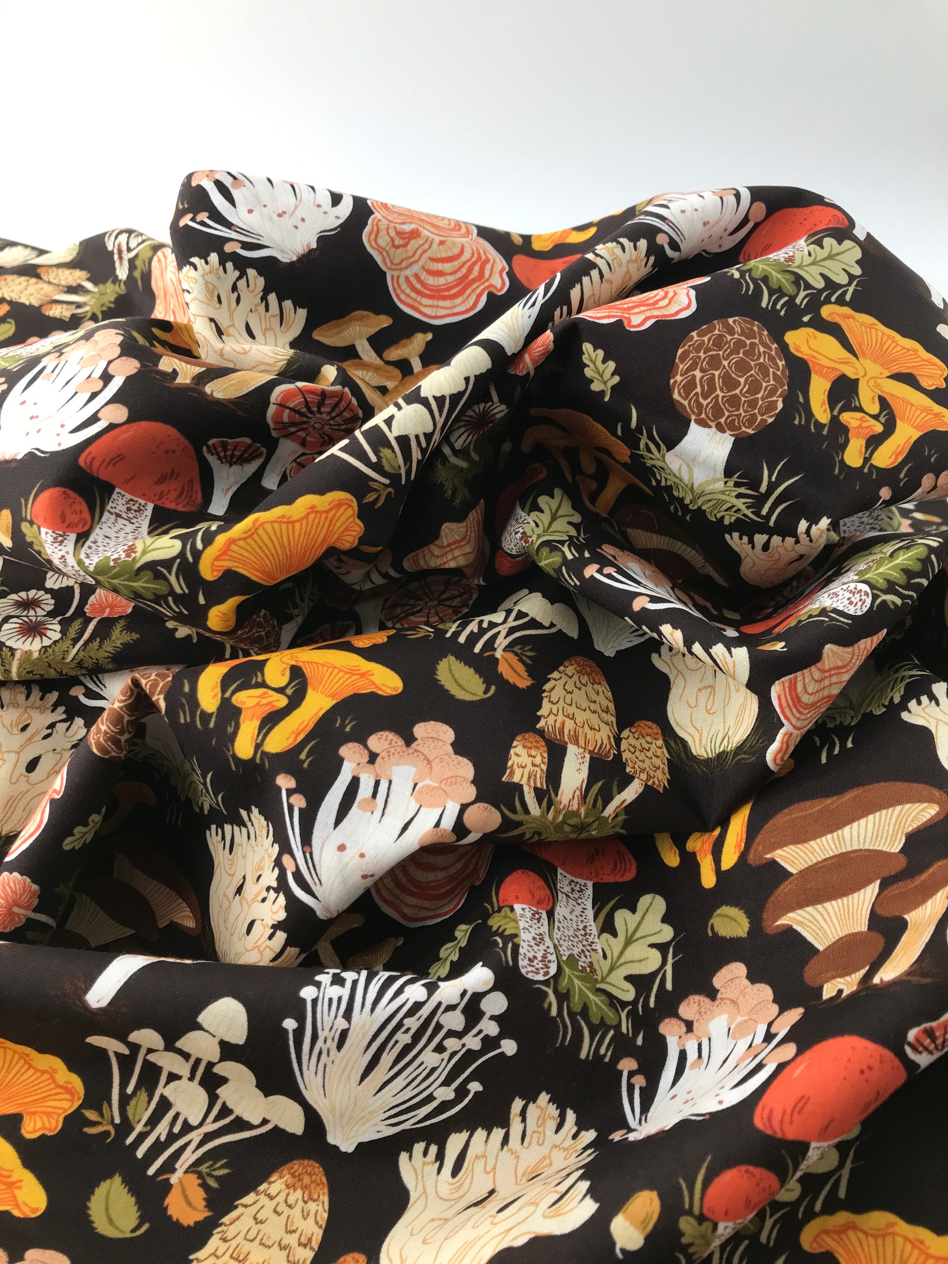 This airy organic cotton lawn is lightweight and soft with a print featuring several varieties of mushrooms in shades of brown, gold, orange and cream on a dark brown ground. The drape is ideal for blouses, lined dresses, skirts, and nightshirts.