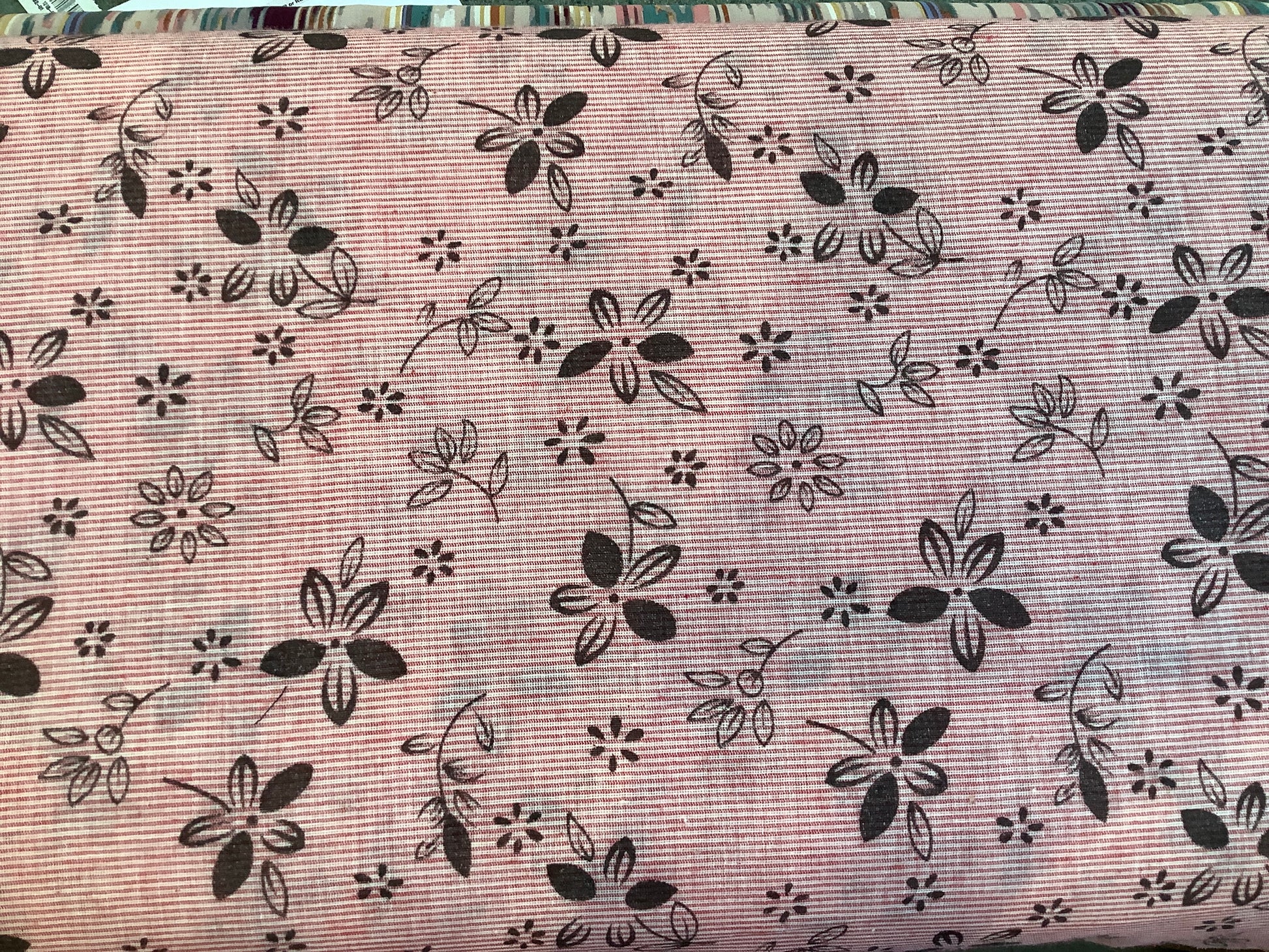 This red and white mini stripe features flowers in deep gray scattered on the face. It is lightweight with a selvedge detail waiting to be used in your design!