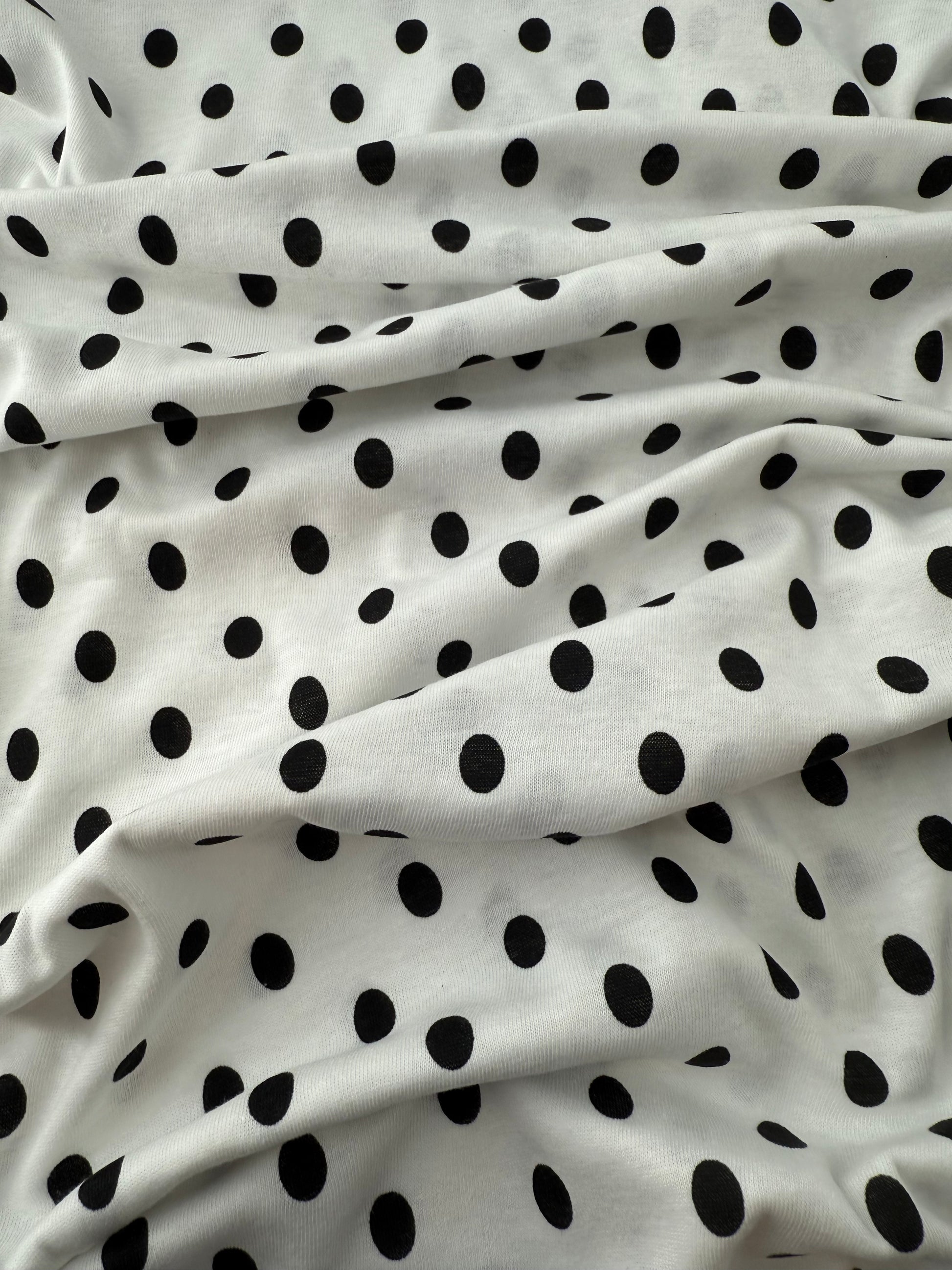 This soft, lightweight single jersey print has a white ground with 1/2" black dots covering it. Ideal for sleep shirts, lounge pants or an easy pull-on skirt with a retro vibe