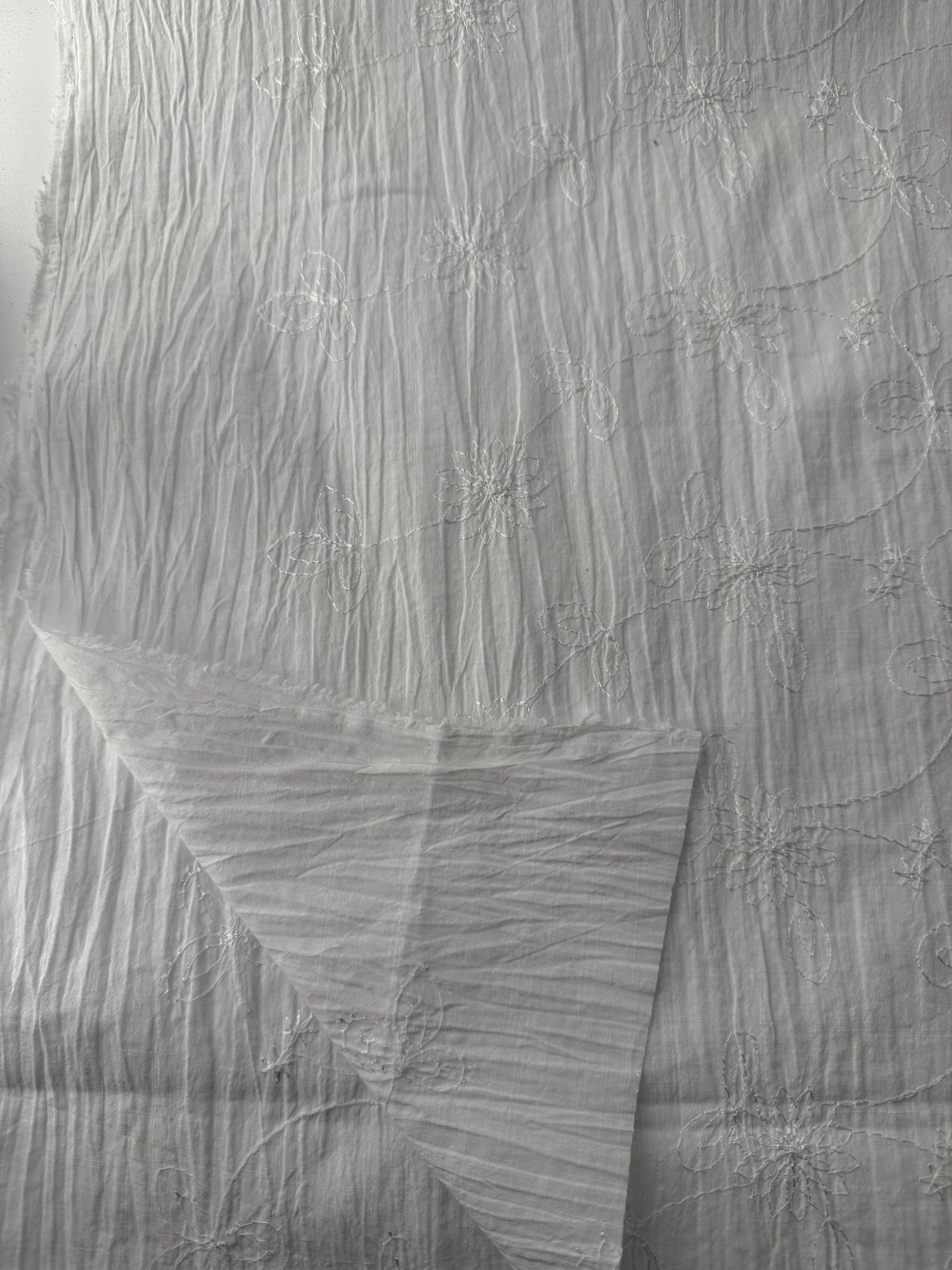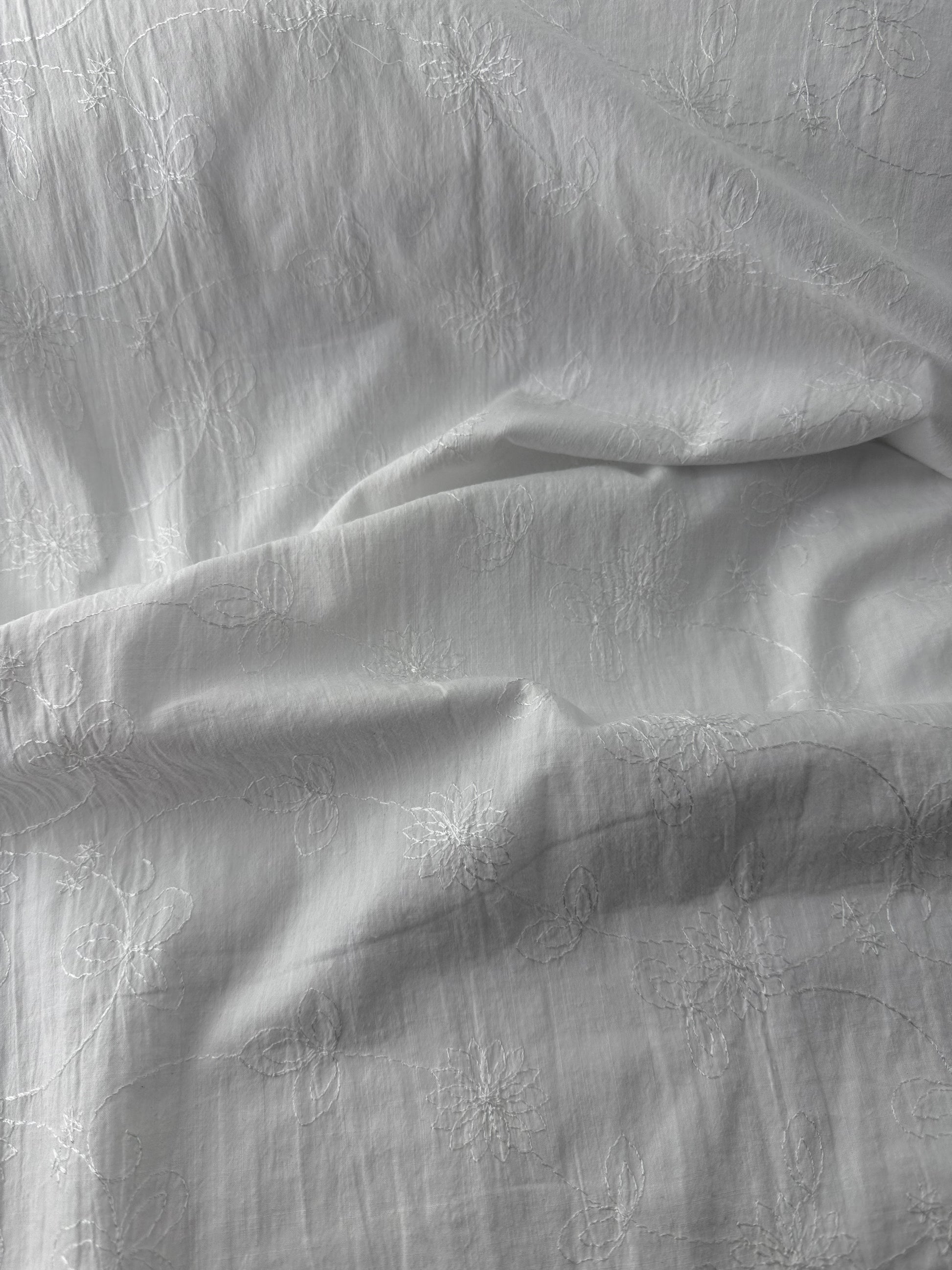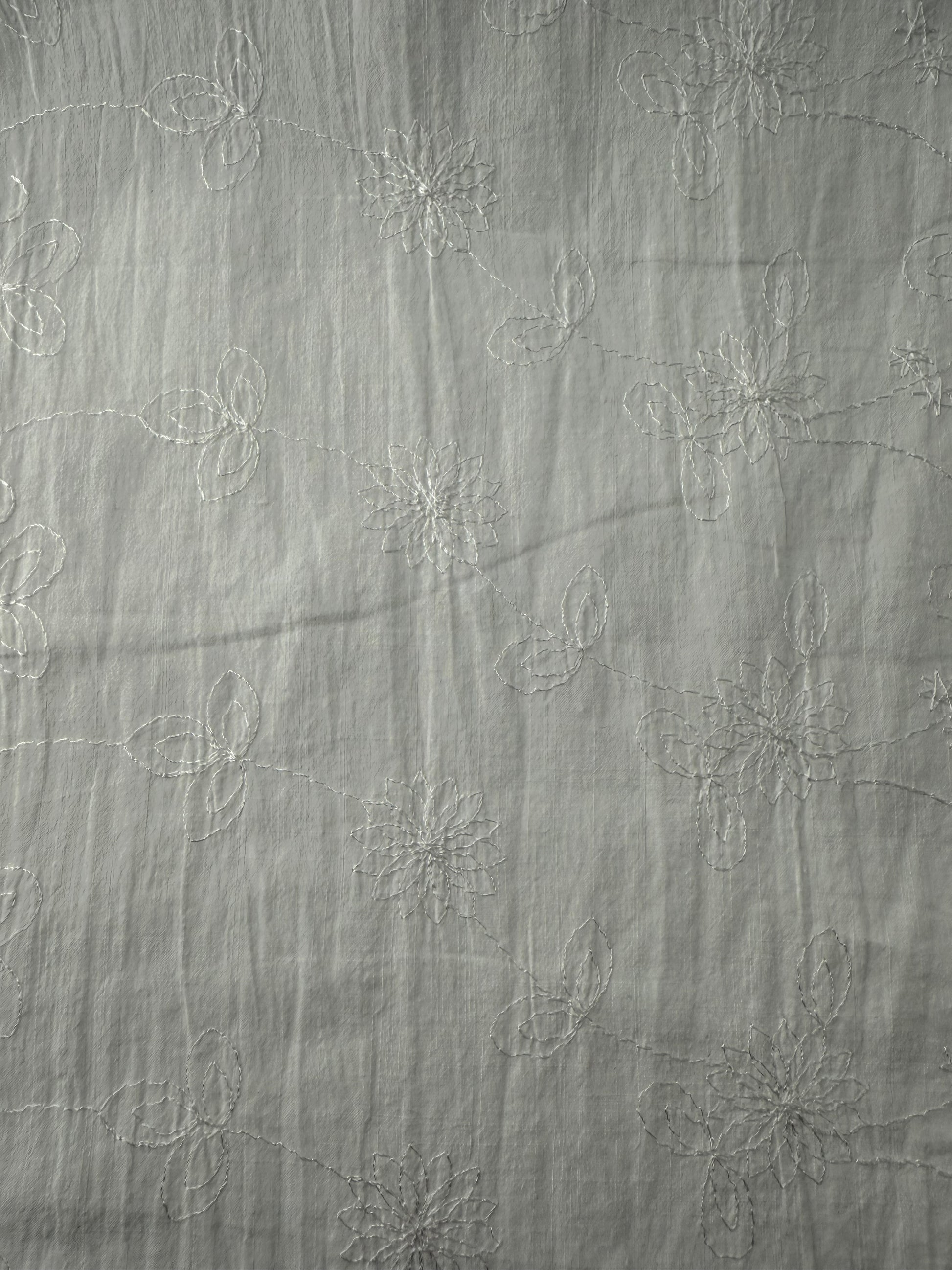 This lightweight semi-sheer cotton fabric has a woven base with an unnoticeable ripstop pattern in slub yarns, embroidered with flowers and vines over its face. Great for nightgowns, and airy shirts and skirts