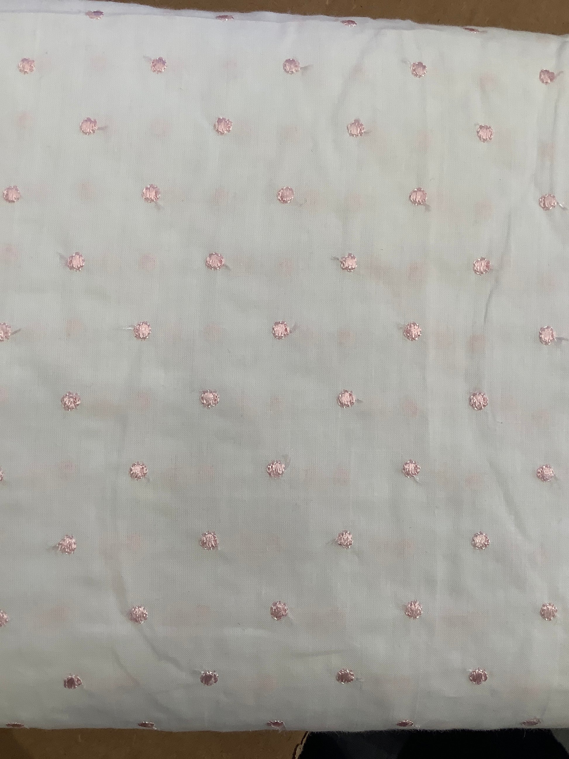 Lightweight cotton fabric, with lovely feel and flow. White background with pink threaded dots that provide some texture.
