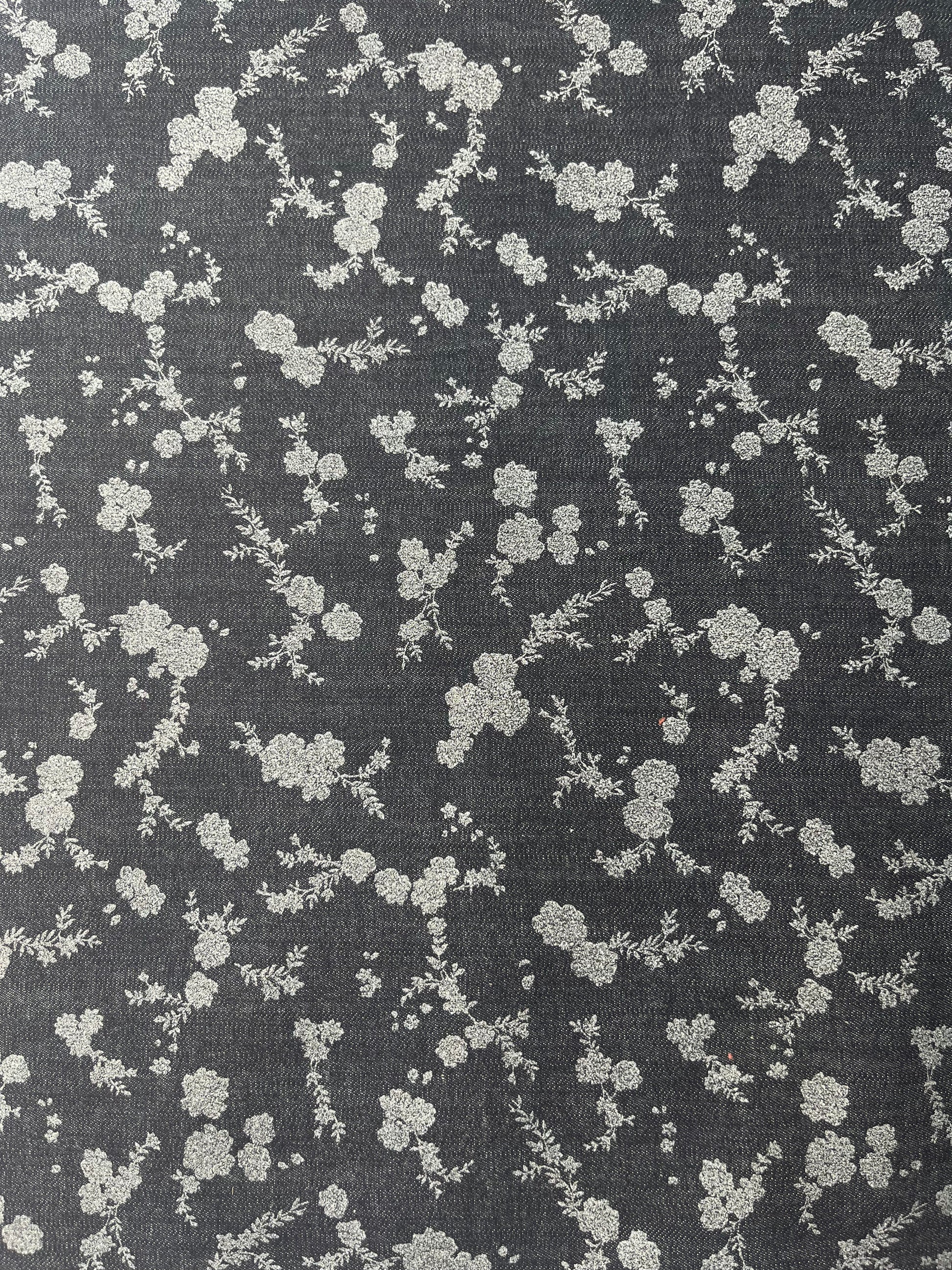This lightweight denim has a hint of polyester for stretch. The ground is a very deep, almost black, indigo color, and it is printed with a floral motif in a subtle silver.It is a good weight for shirts, skirts and dresses