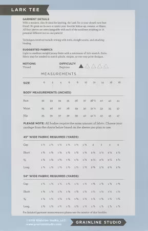 With a modern, slim fit ideal for layering, the Lark Tee is your closet's new best friend. It's great on its own or under your favorite button up, sweater, or blazer. All four sleeves are interchangeable with each of the necklines resulting in 16 potential different tees in one pattern! Techniques involved include sewing with knits, straight seams, and attaching binding. SUGGESTED FABRICS Light to medium weight jersey knits with a minimum of 20% stretch. Extra fabric may be needed to match plaids, stripes, and one way print designs