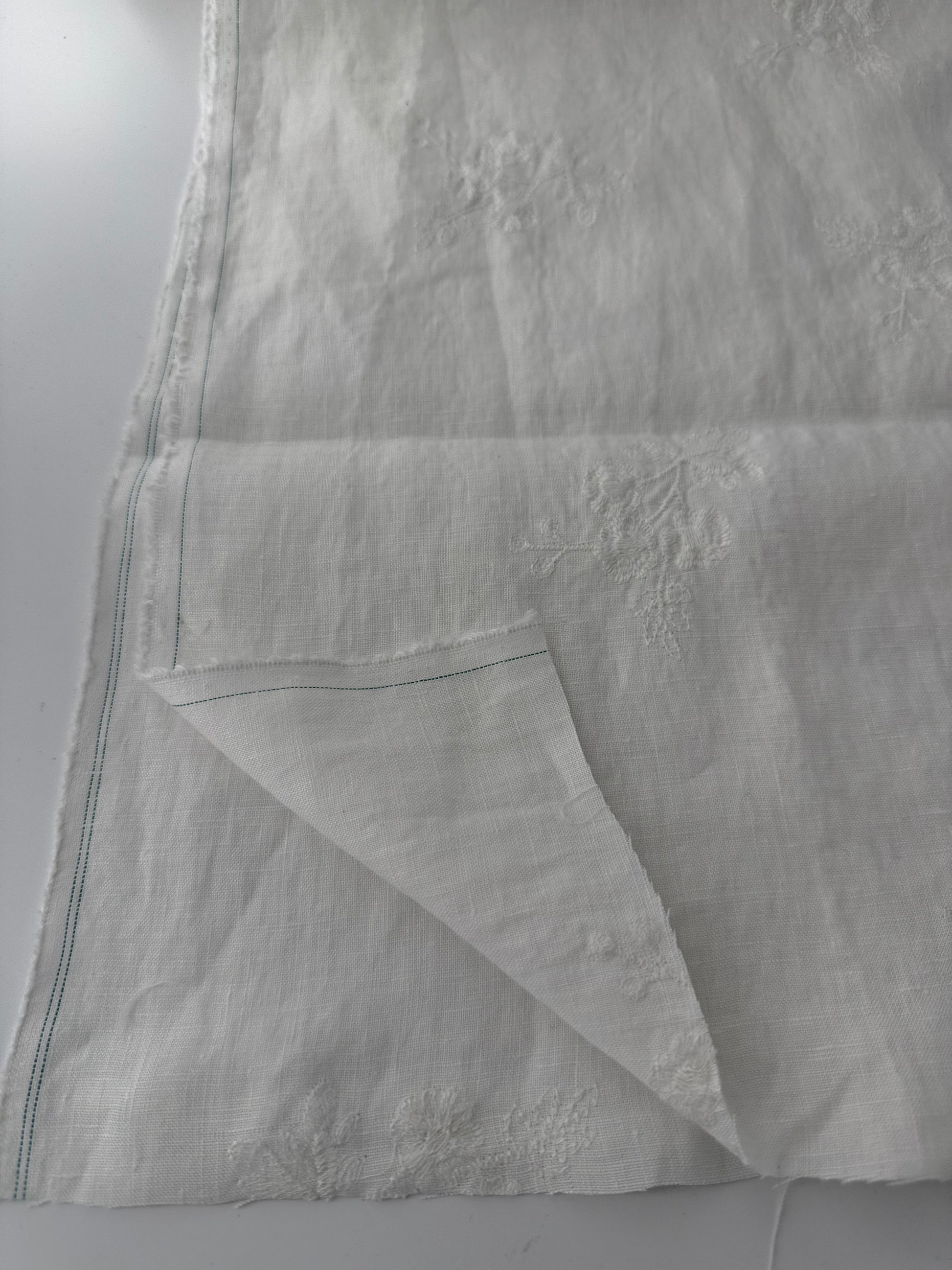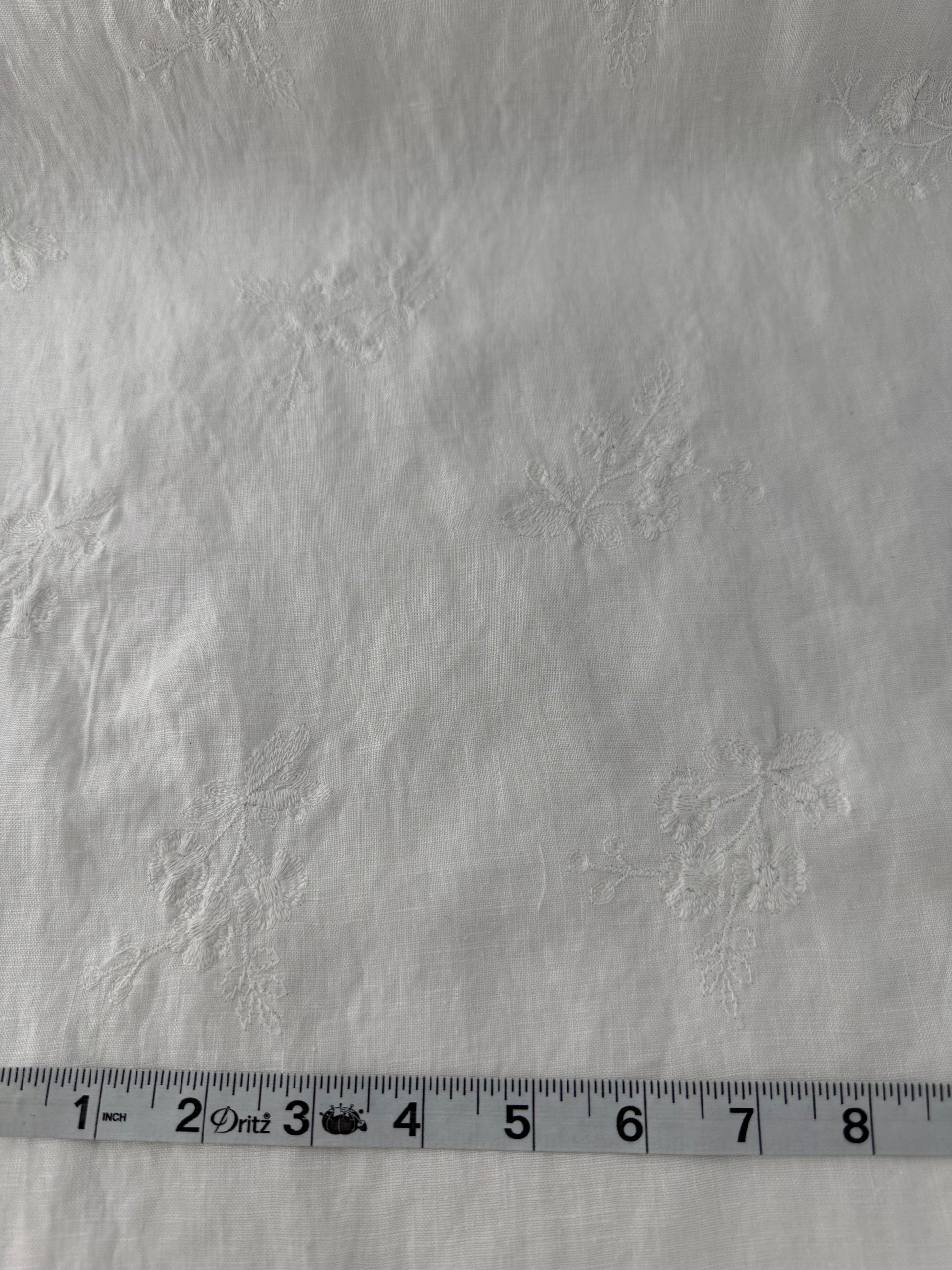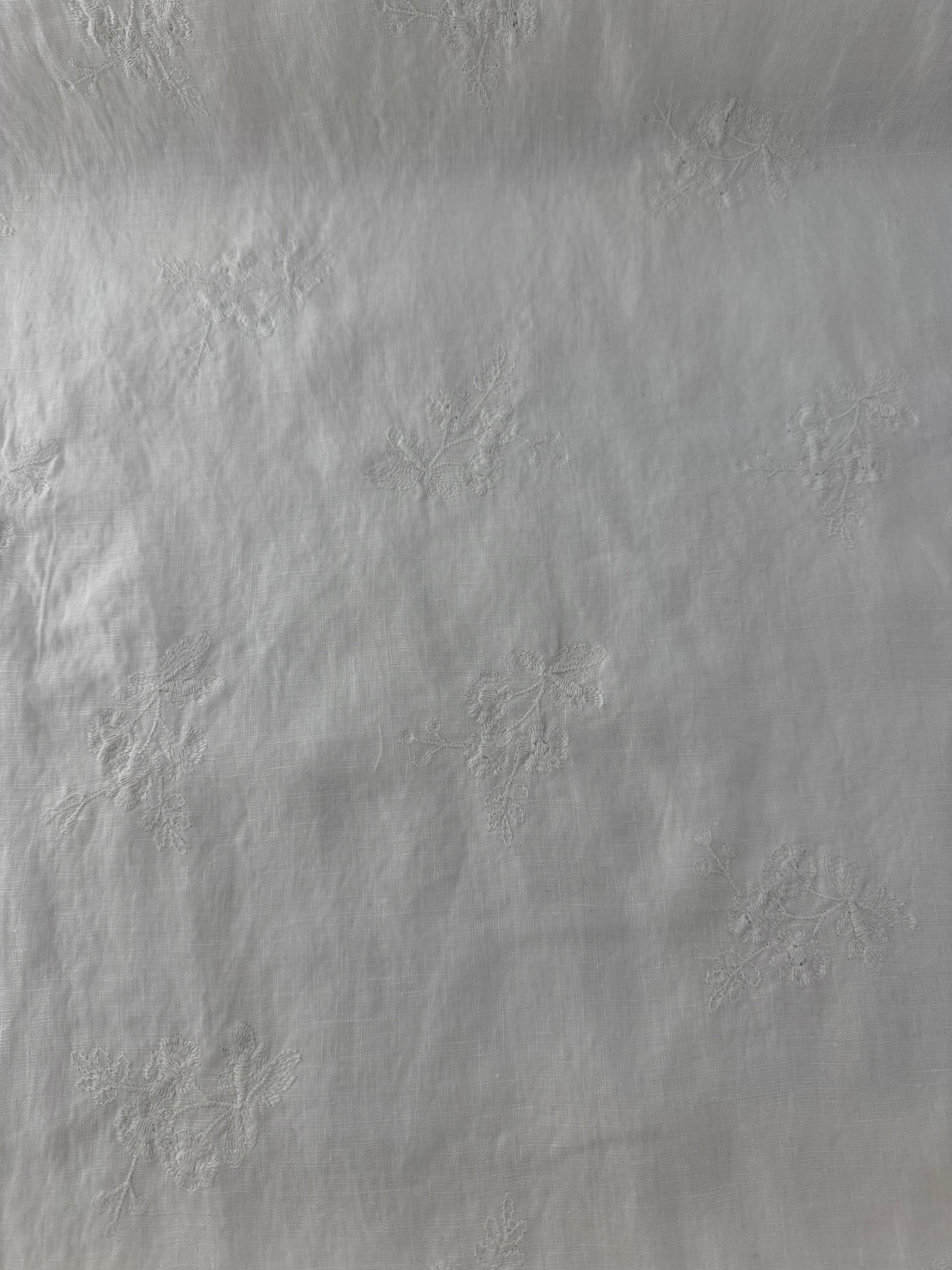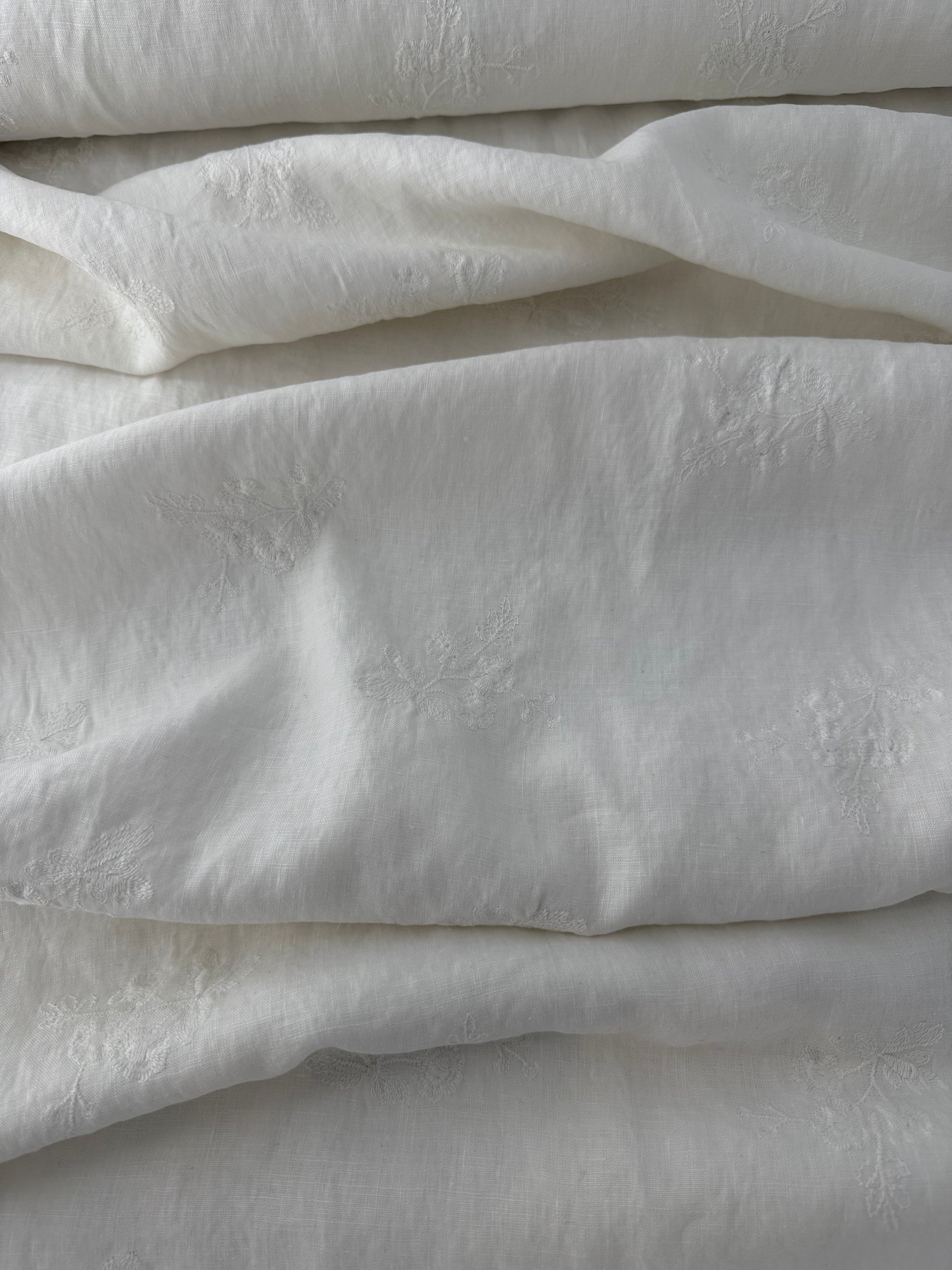 This medium-weight linen features a flower & branch embroidery scattered at 5-6" intervals. It is laundered and has a soft hand, a lightly structured drape and is semi-sheer. This fabric would be perfect for home decor as well as garments like blouses, shirts, lined dresses and skirts, and more