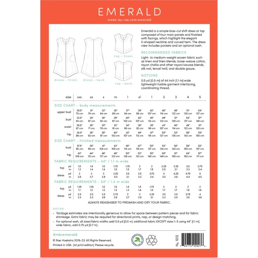 Emerald is a simple shift dress or top designed to offer comfort in the summer heat. Envision it with sandals and a hat on hot days, or layered under a warm sweater or cowl as the seasons change and the days turn cool. The garment is composed of four main panels and is finished with facings, which highlight the elegant V-shaped neckline and curved hem. The dress view includes pockets and an optional sash