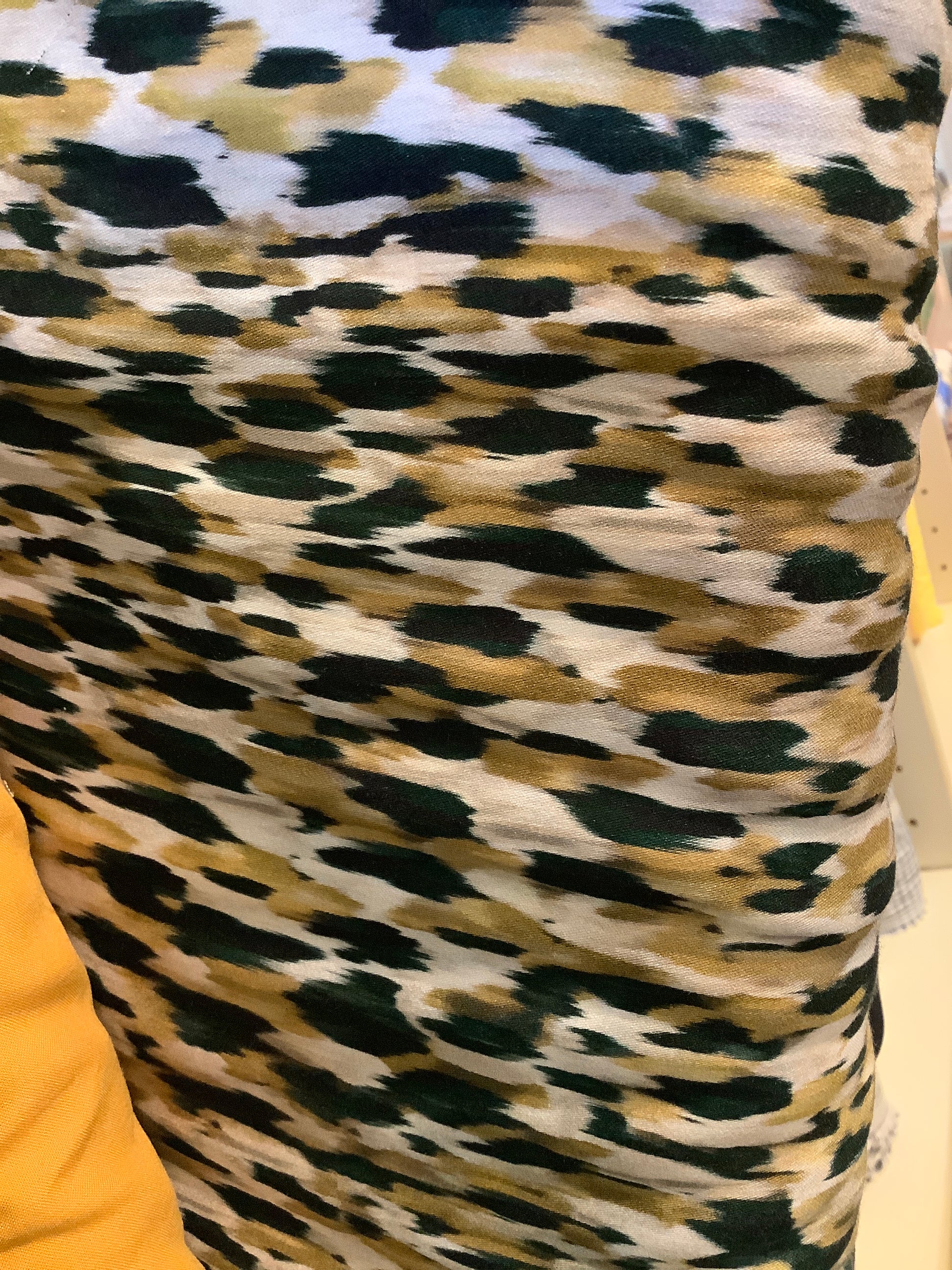 Abstract leopard print. Gold, black, hunter green, and ivory "leopard" print. Smooth and lightweight feel, would drape beautifully as a dolman sleeve blouse or flowy pants