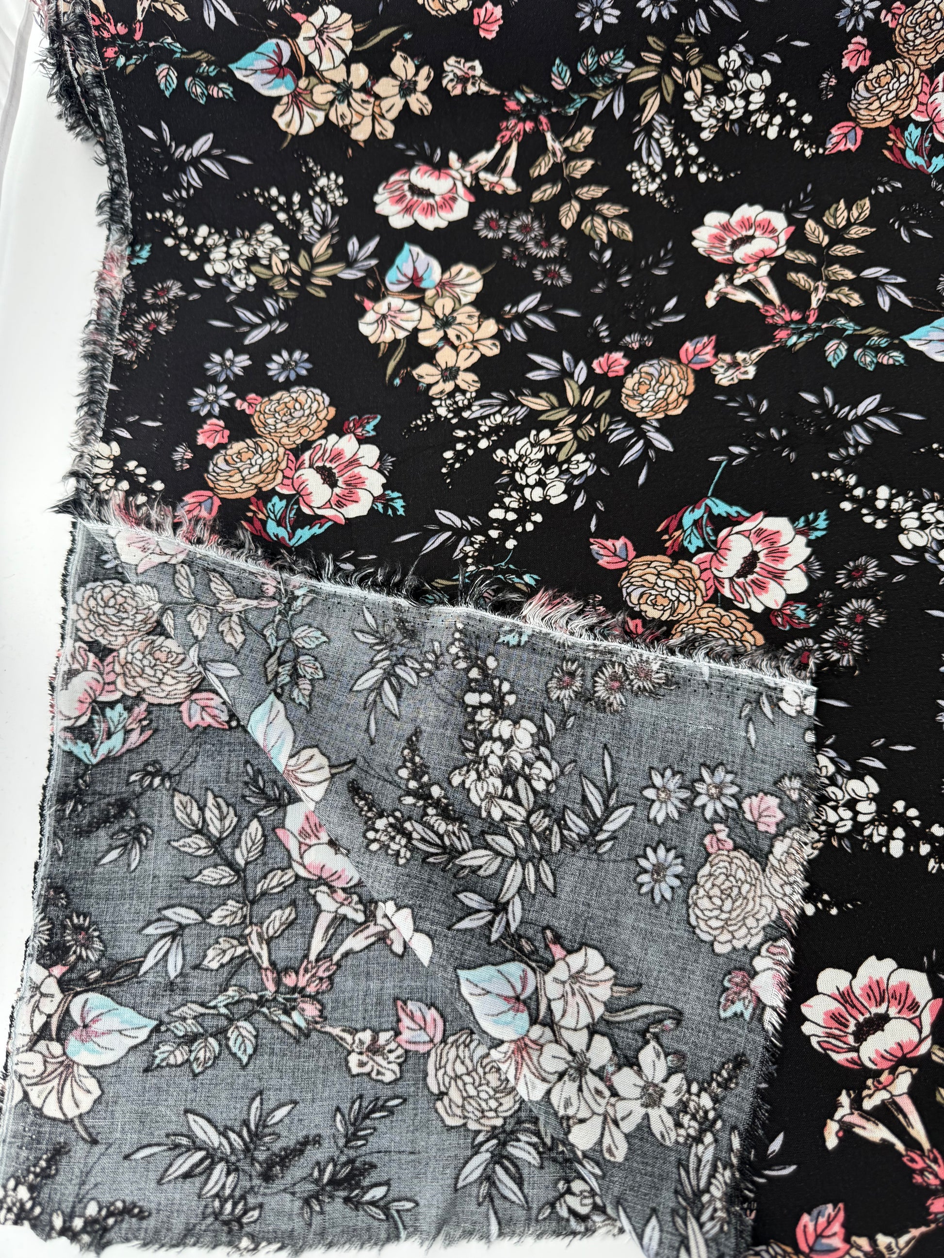 This rayon challis fabric has a floral print in shades of pink, beige, lavender, and turquoise. With a smooth handfeel and fluid drape, it is perfect for blouses, dresses and flowing pants