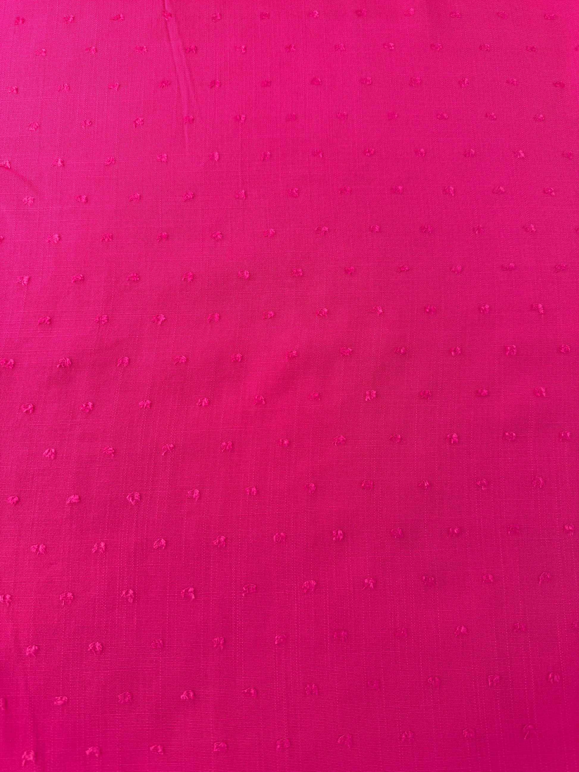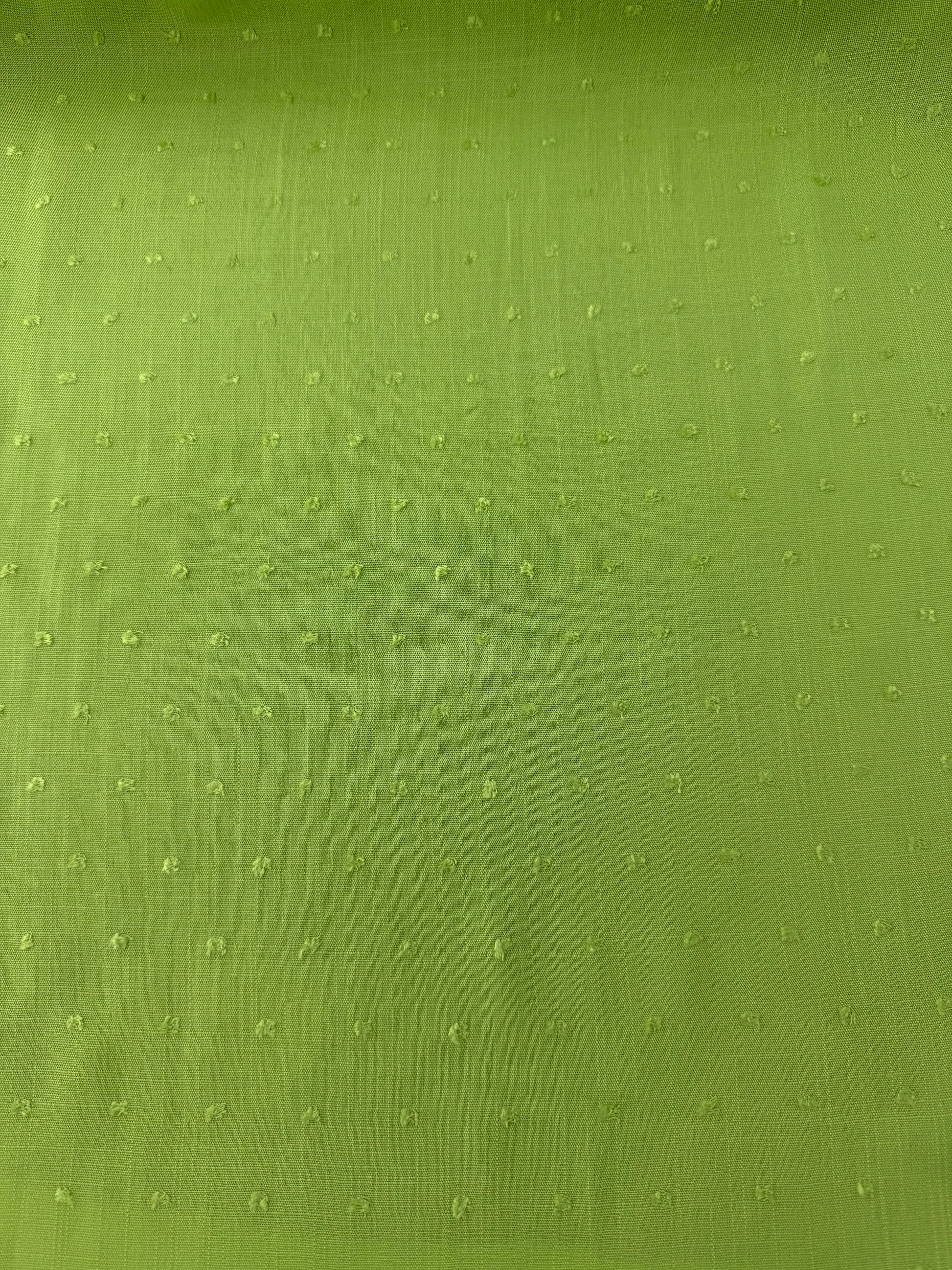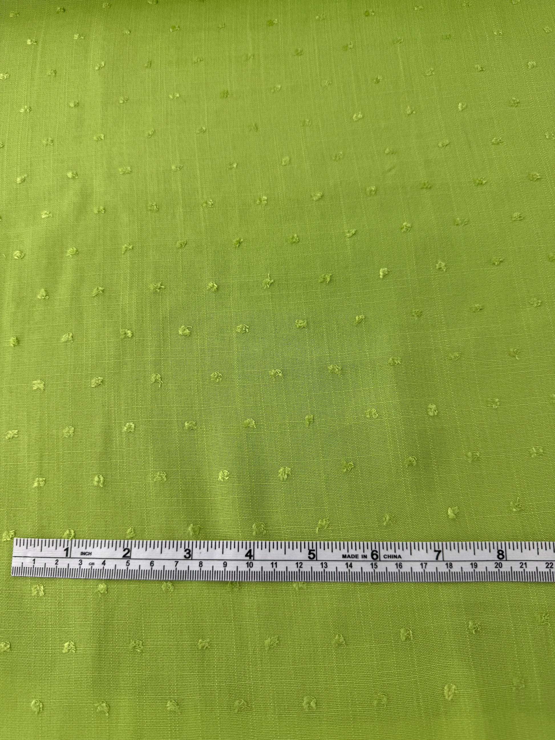 This lightweight plain weave rayon made with slub yarns, has a swiss dot effect on its face. It has a drapey hand and semi-sheer effect. It would be great for blouses, shirts Choose from bright pink or lime green for your creations