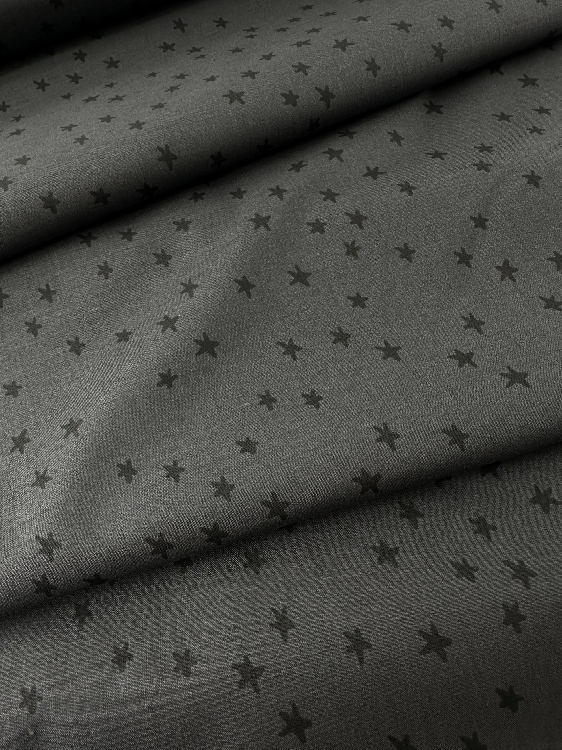 This quilting weight cotton is great for quilts and home decor, but can also be used for garments, such as dresses, skirts, and pajamas. The ground is charcoal gray with black stars scattered on it
