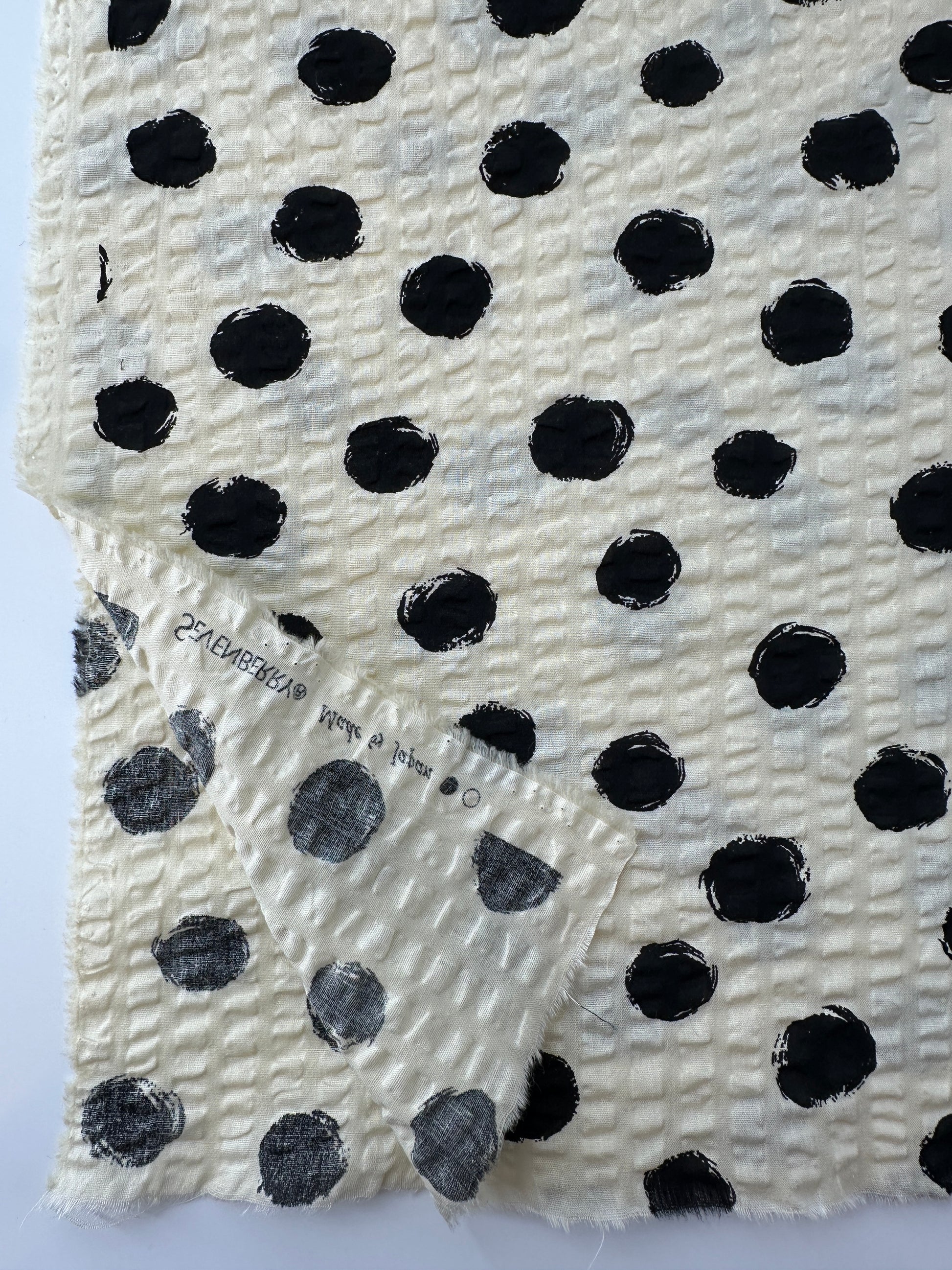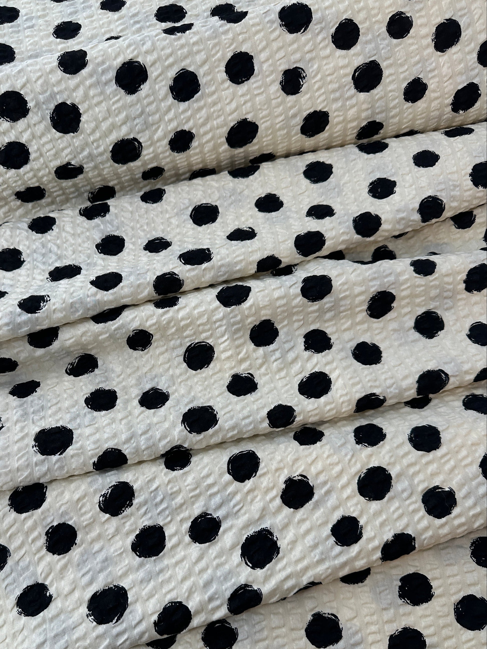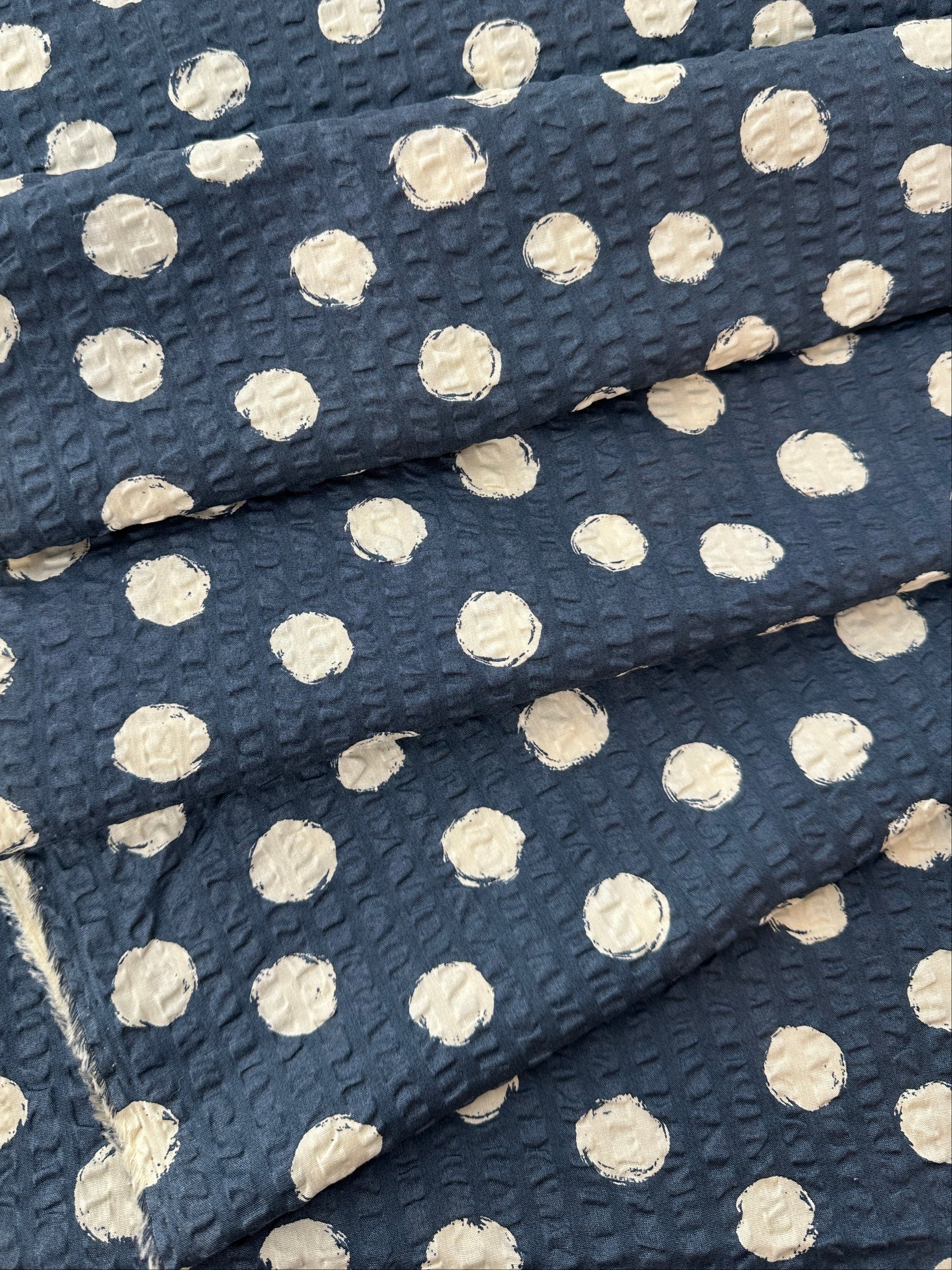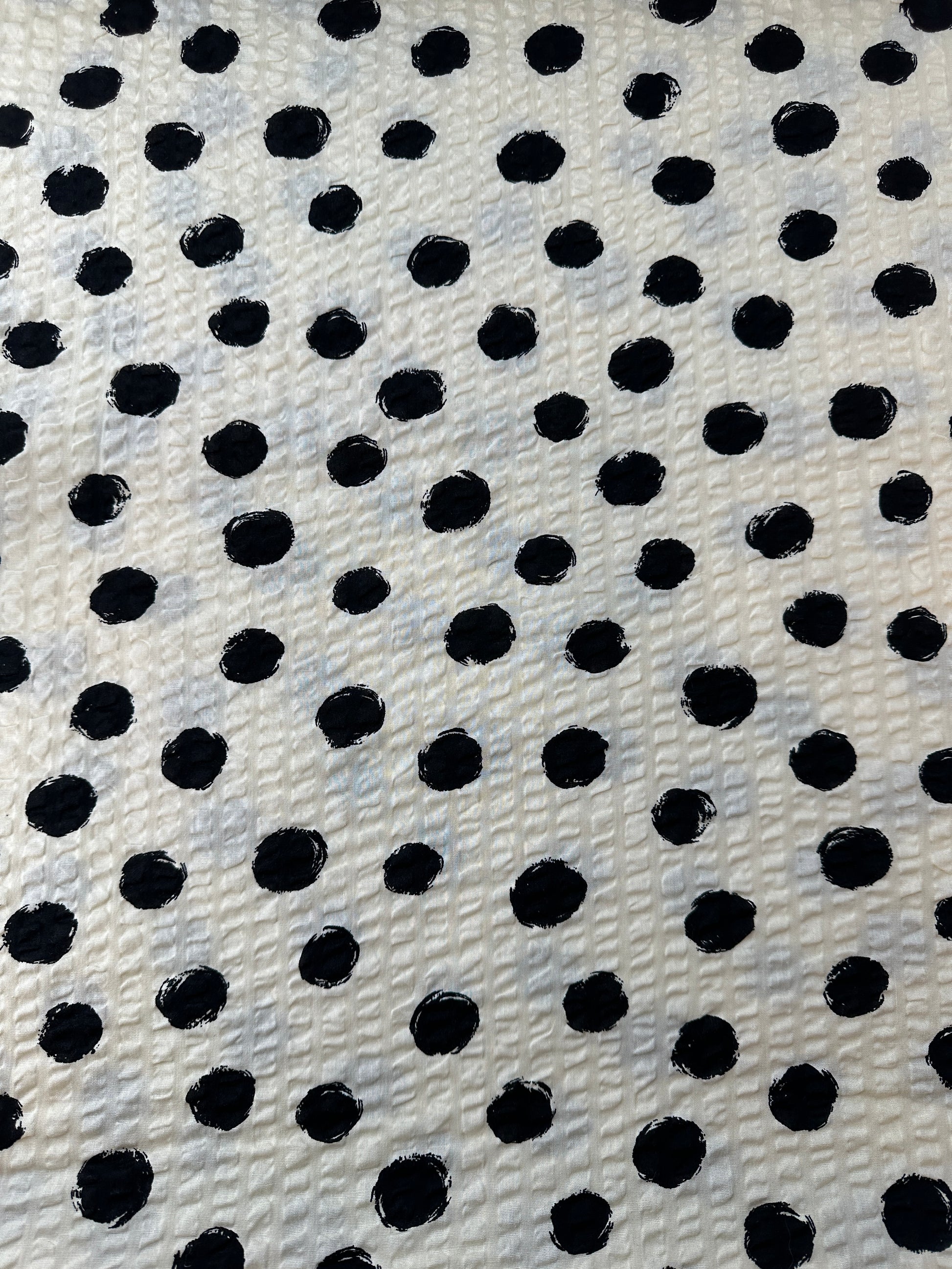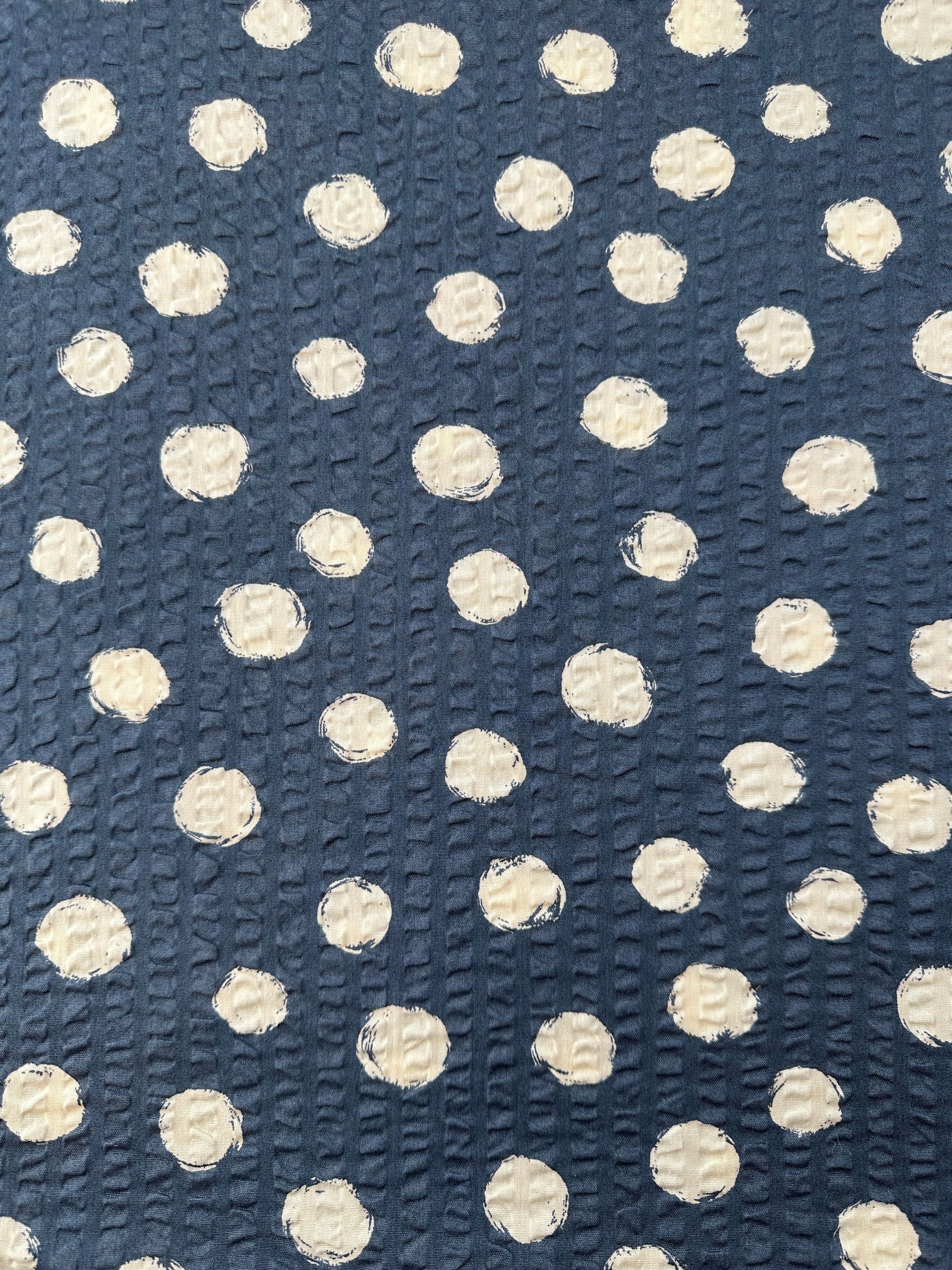 The ripple-like texture of this fabric is reminiscent of seersucker, and it has the same light airy feel. The ripples minimize contact with the skin, making it an ideal material for summer, great for all types of warm weather clothing.