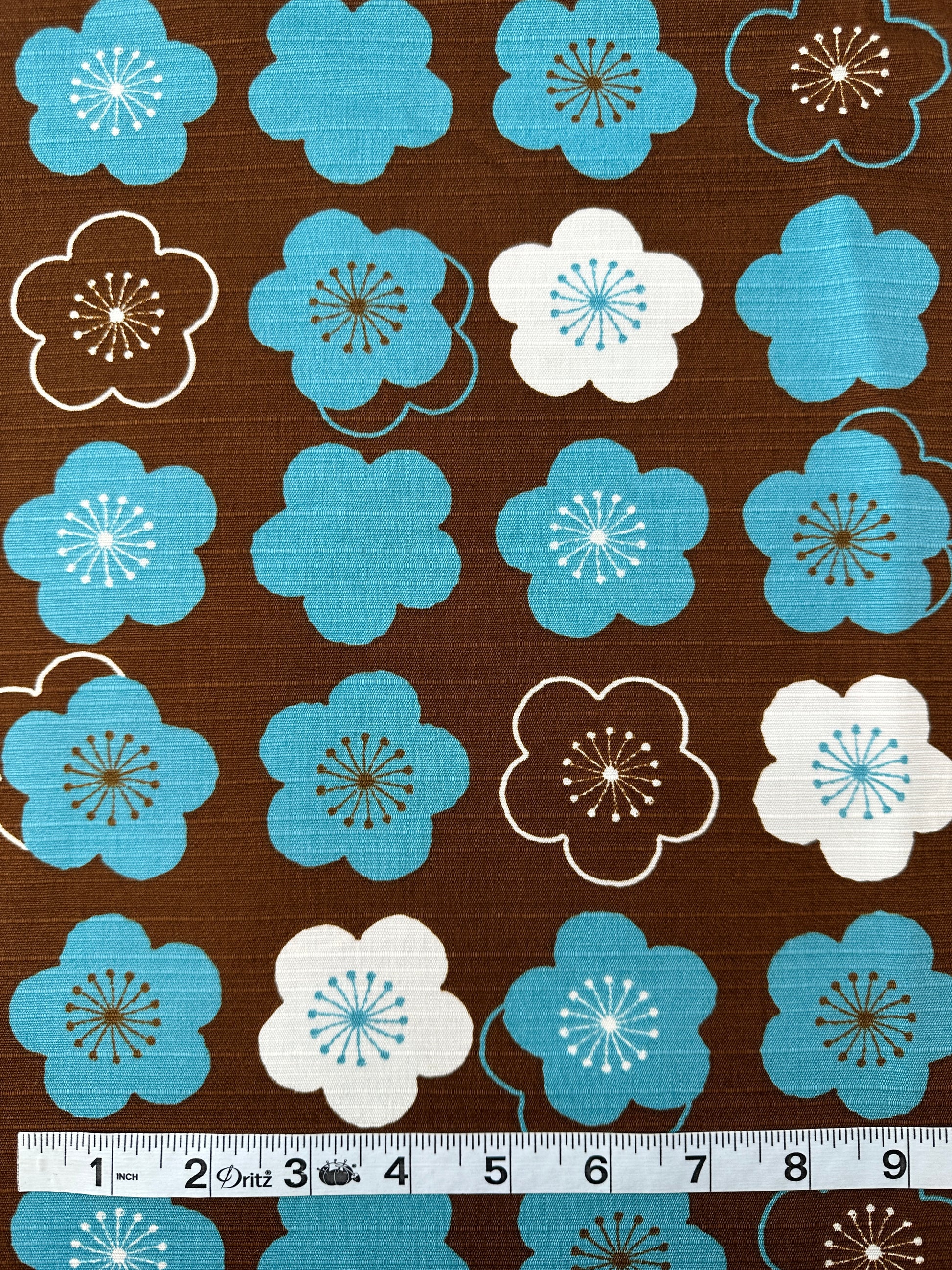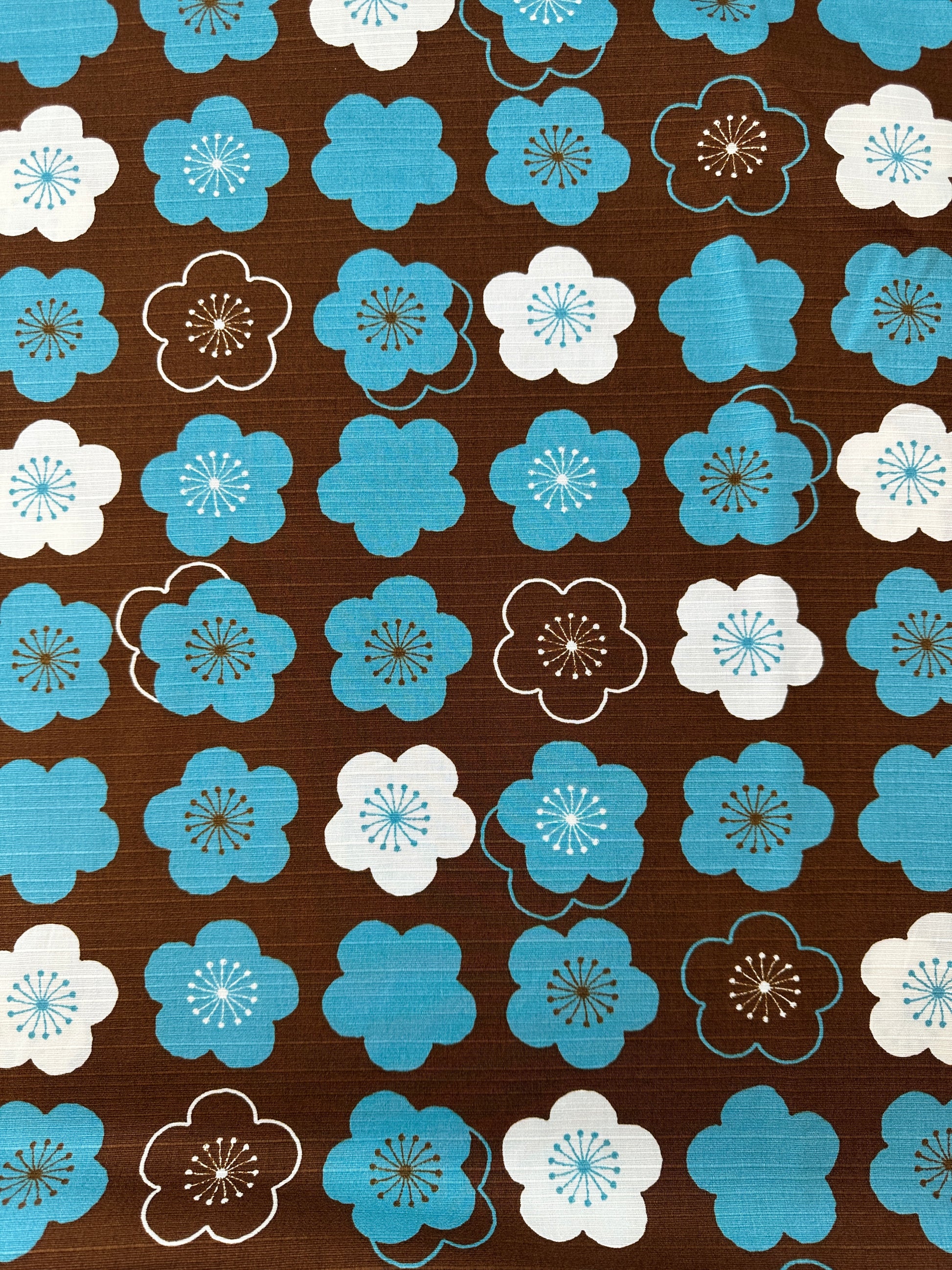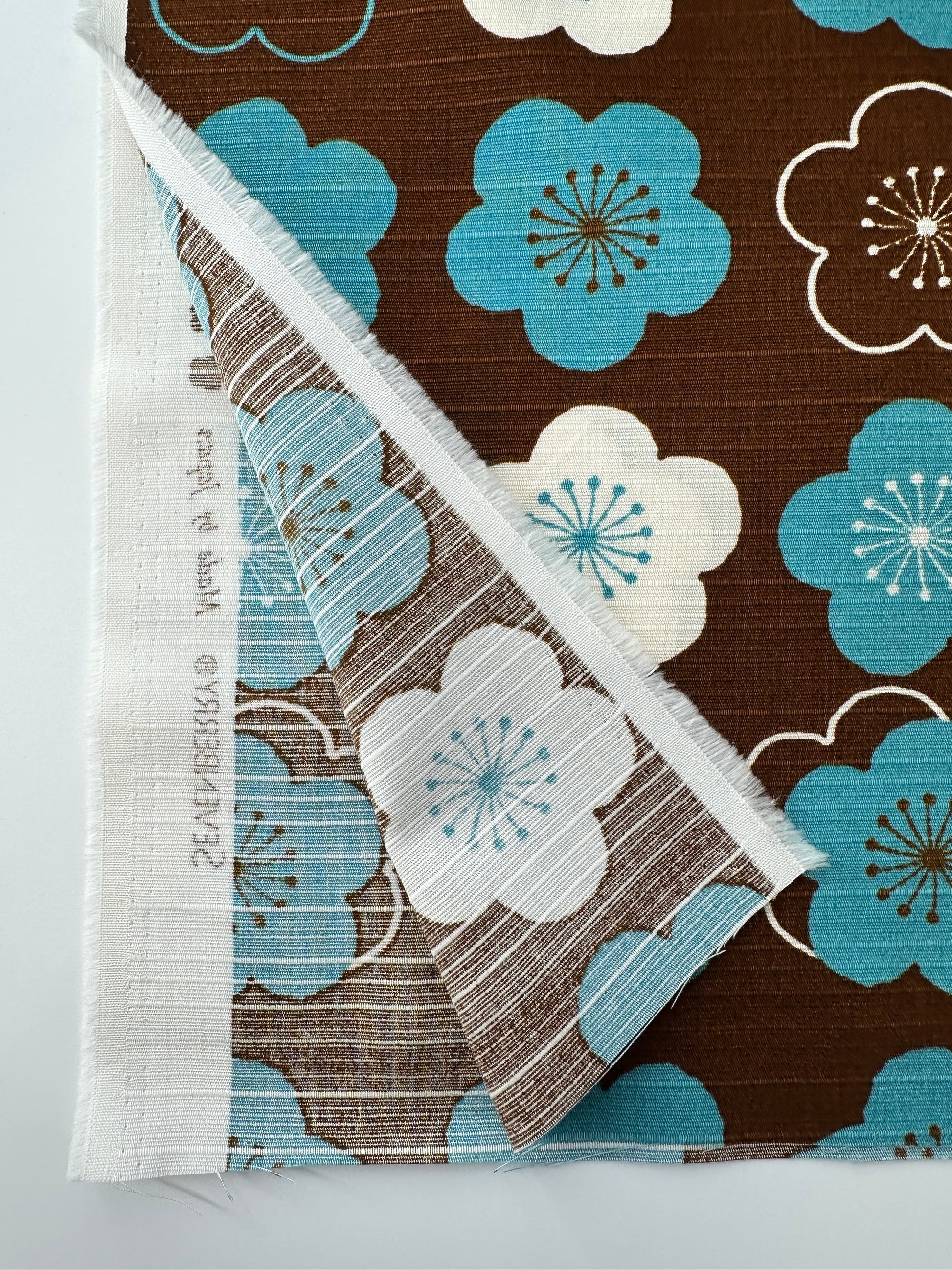 Made of cotton shantung, with a noticeable weft yarn, this textured fabric has structured body. The print is an abstract cherry blossom, in teal and off-white, on a cocoa brown ground. Great for shirts, dresses and jackets, as well as home decor