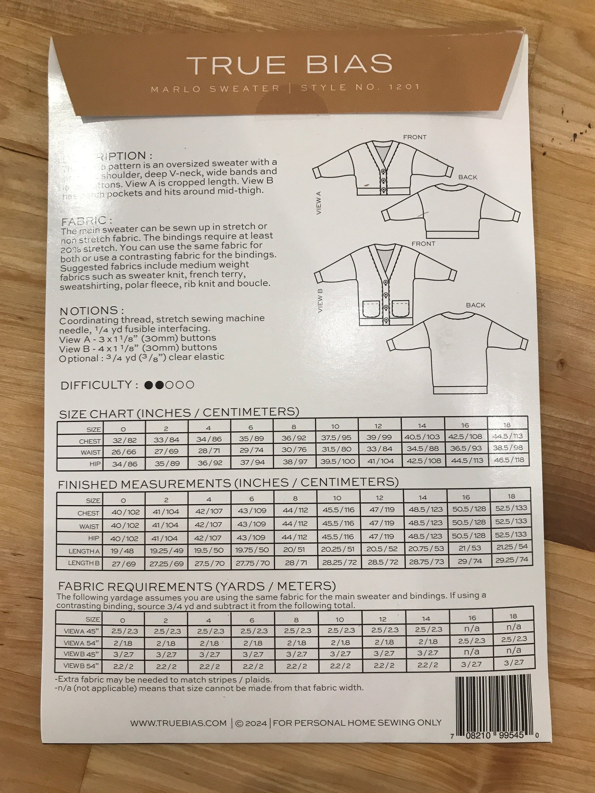 The Marlo pattern is an oversized sweater with a dropped shoulder, deep V-neck, wide bands and large buttons. View A is cropped length. View B has patch pockets and hits just below the hip.