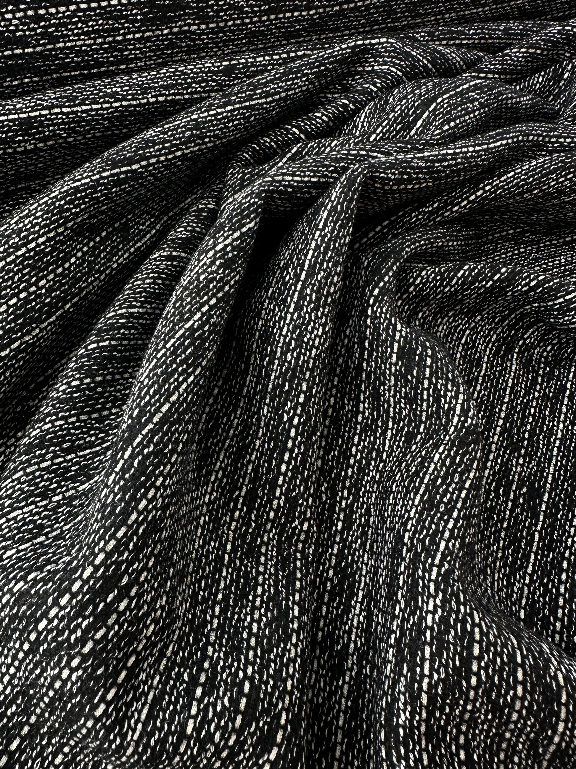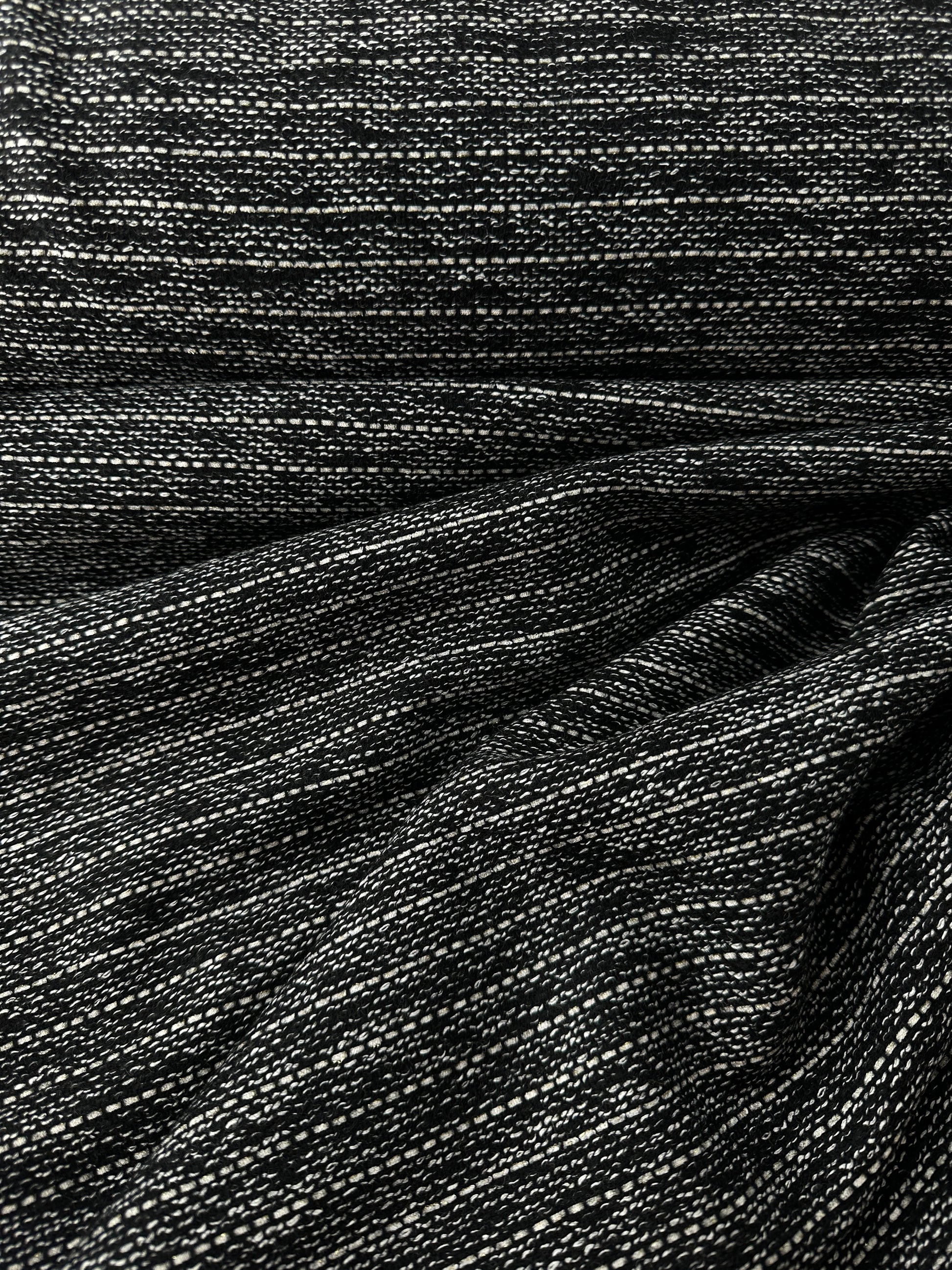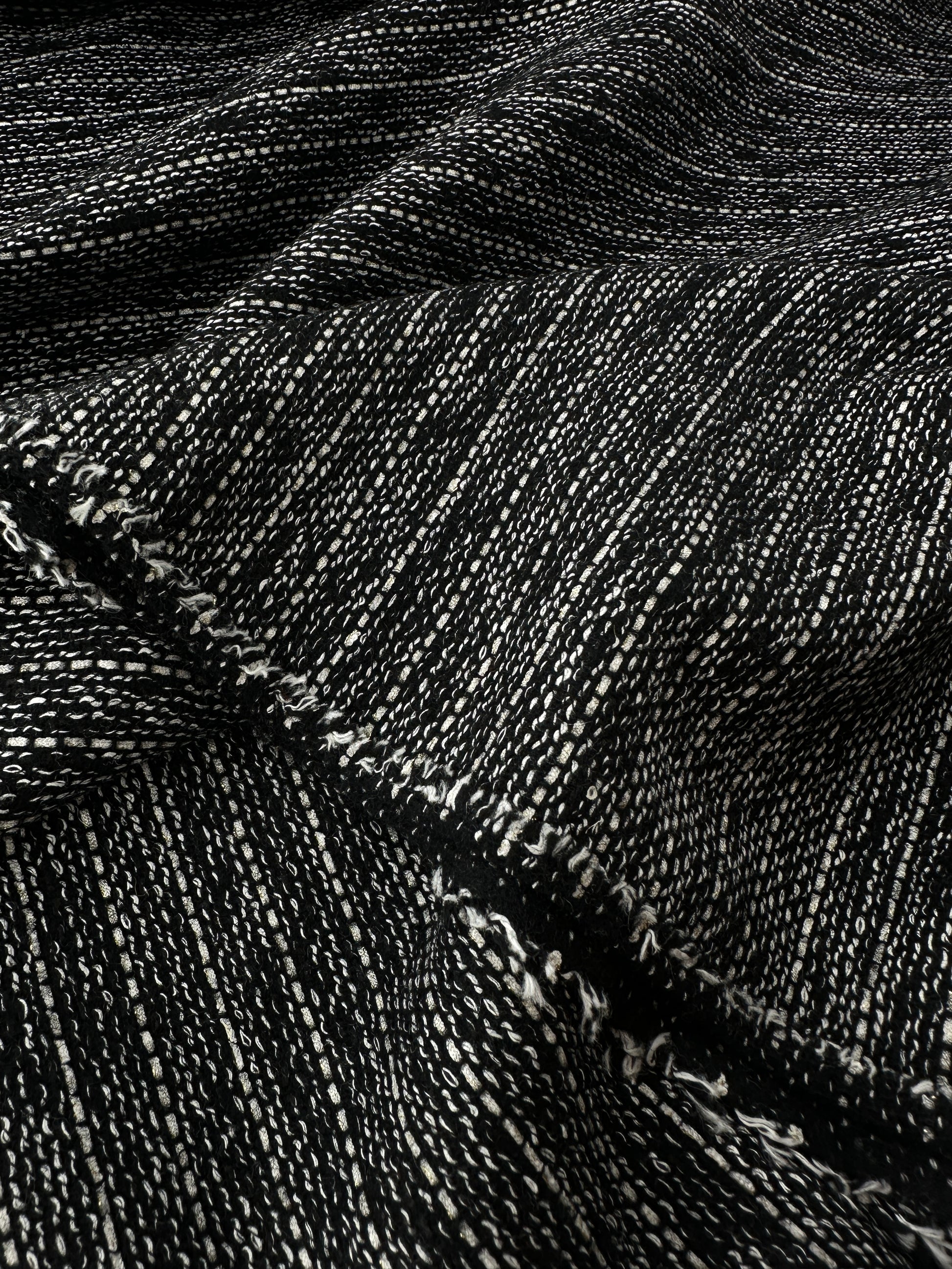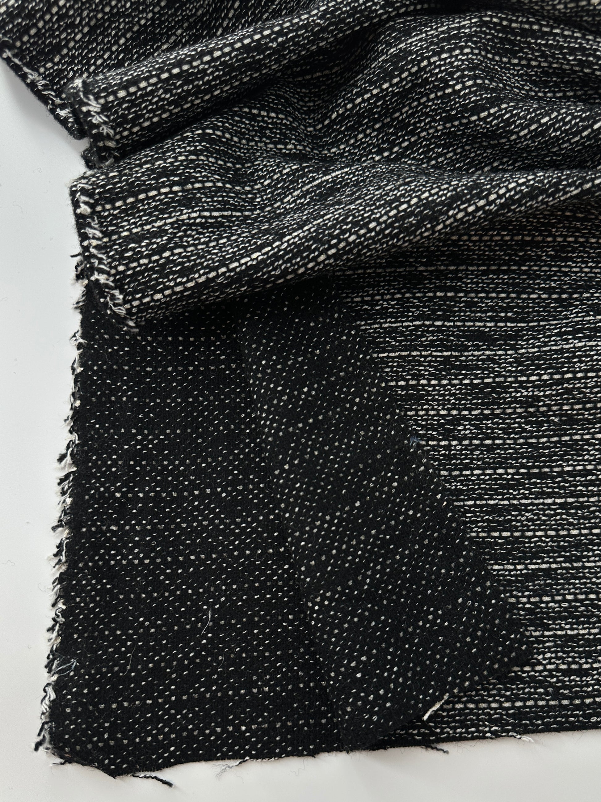 This wool fabric consists of black warp yarns and weft yarns of thick and thin ivory, interspersed with black yarns and the slightest hint of lurex. It is lovely from both the back and the face. The medium weight and structured drape are perfect for jackets, skirts and lined dresses